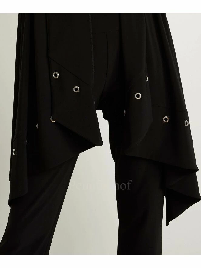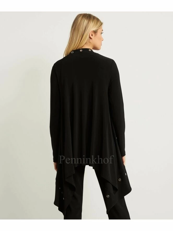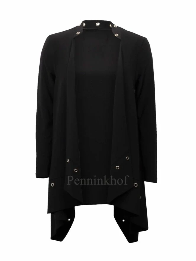 Cardigan ample de la marque Joseph Ribkoff, de couleur noire. Des œillets décoratifs en métal argenté ornent le col et le bas du cardigan. Modèle sans fermeture. Lavage à la main.