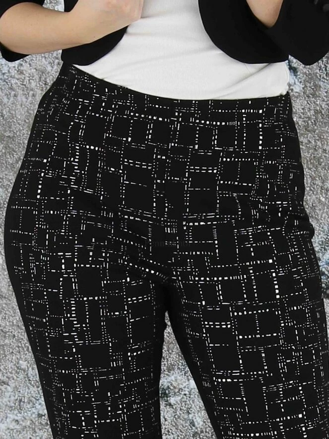 Pantalon de la marque Joseph Ribkoff, à motif de lignes pointillées et croisées en gris argenté en relief sur un fond noir. L’arrière est de couleur noire unie. La taille est élastiquée. Lavage à la main.