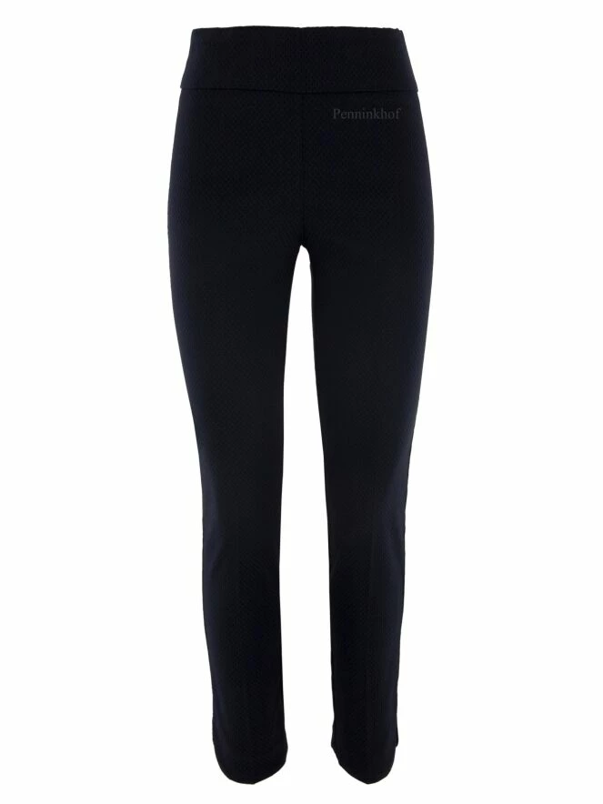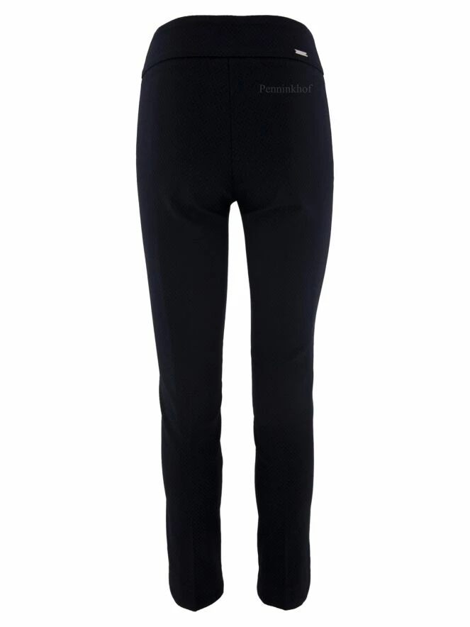 Pantalon de la marque Joseph Ribkoff, à structure gaufrée de couleur bleu nuit. Sa large taille est élastiquée. Au bas des jambes, les fentes sont à bords arrondis. Lavage à la main.