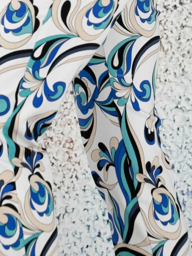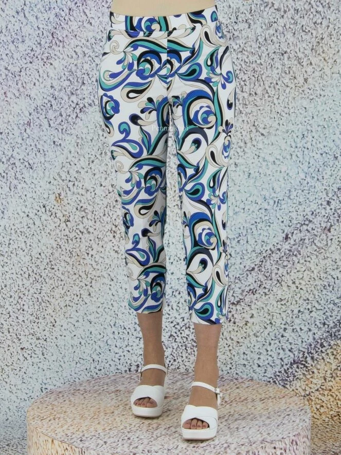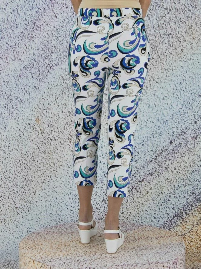 Pantalon de la marque Joseph Ribkoff, à imprimé pop art aux multiples nuances de bleu sur fond blanc. Une bande élastique équipe la taille. Lavage à la main.
