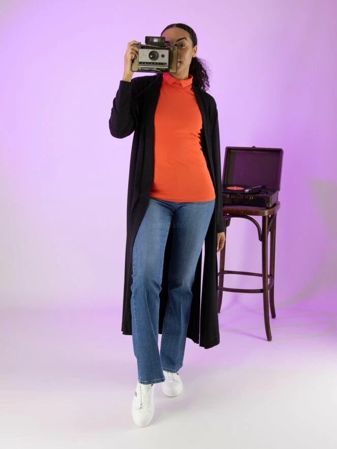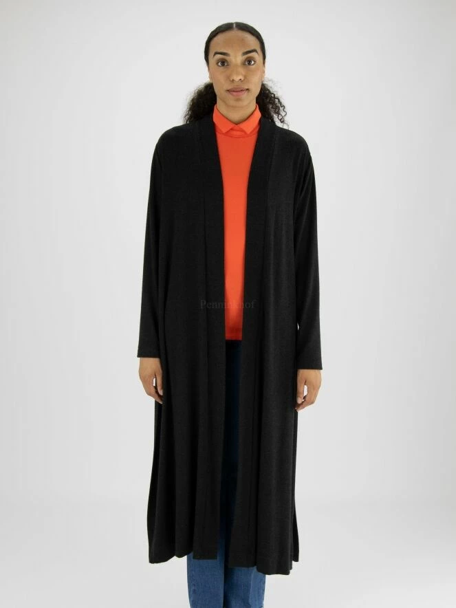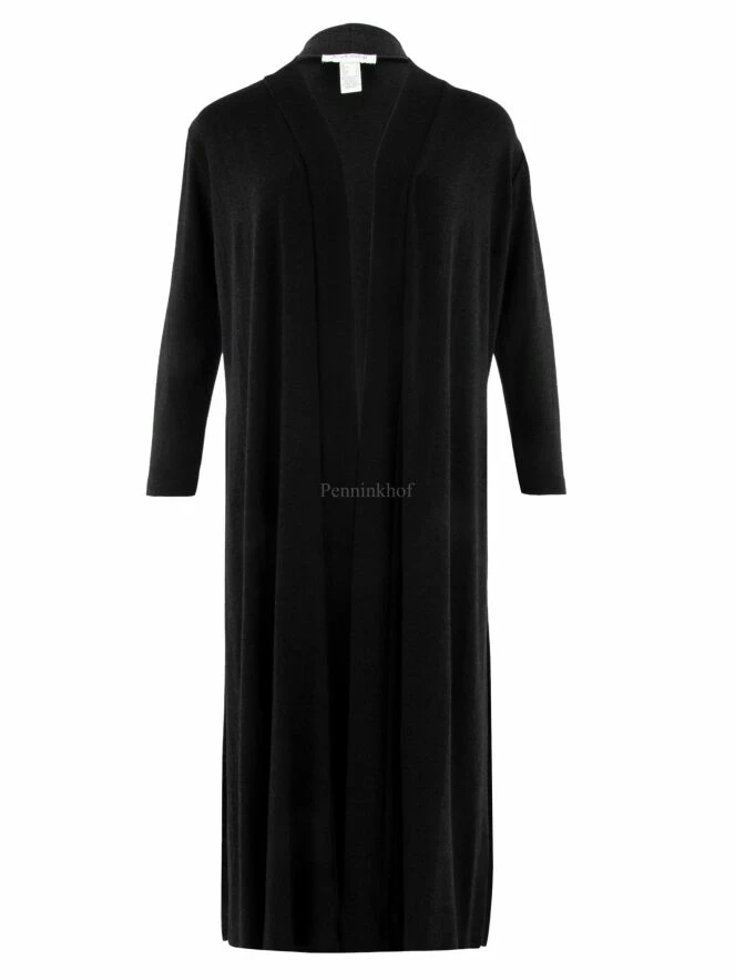 Long cardigan de la marque Joseph Ribkoff, de couleur gris foncé. Le cardigan n’a pas de fermeture et présente un col châle. Lavage à la main.