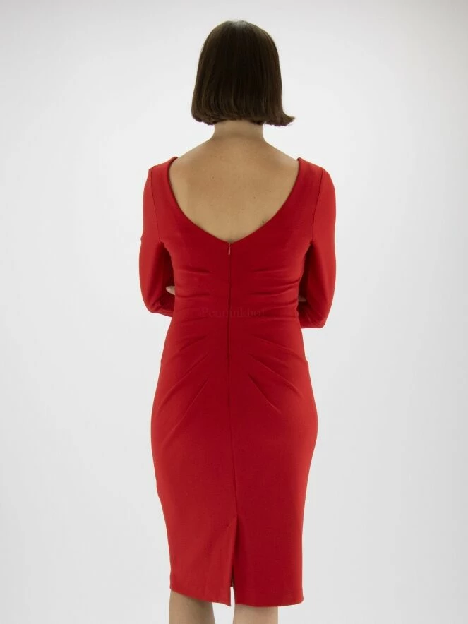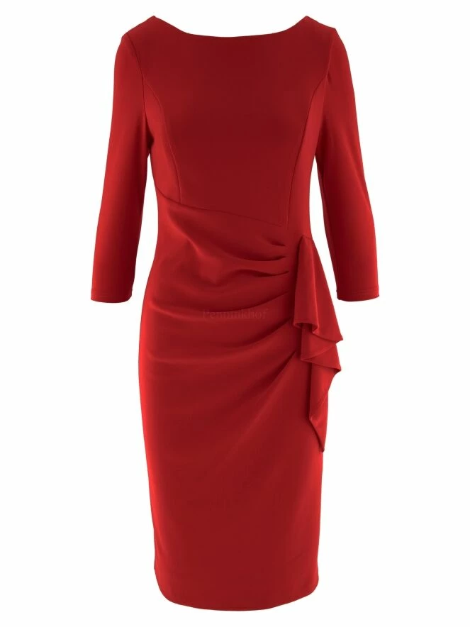 Robe à manches mi-longues de la marque Joseph Ribkoff, de couleur rouge. L’encolure ronde sur le devant devient libre jusqu’aux omoplates dans le dos. Sur le devant au niveau de la taille, de larges plis horizontaux créent un effet drapé agrémenté d’un long volant en s’attachant à l’autre côté. Dans le dos, de nombreux plis sont présents de part et d’autre du zip de fermeture en formation de chevrons. Une fente d’aisance est présente au bas de la robe. Lavage à la main.