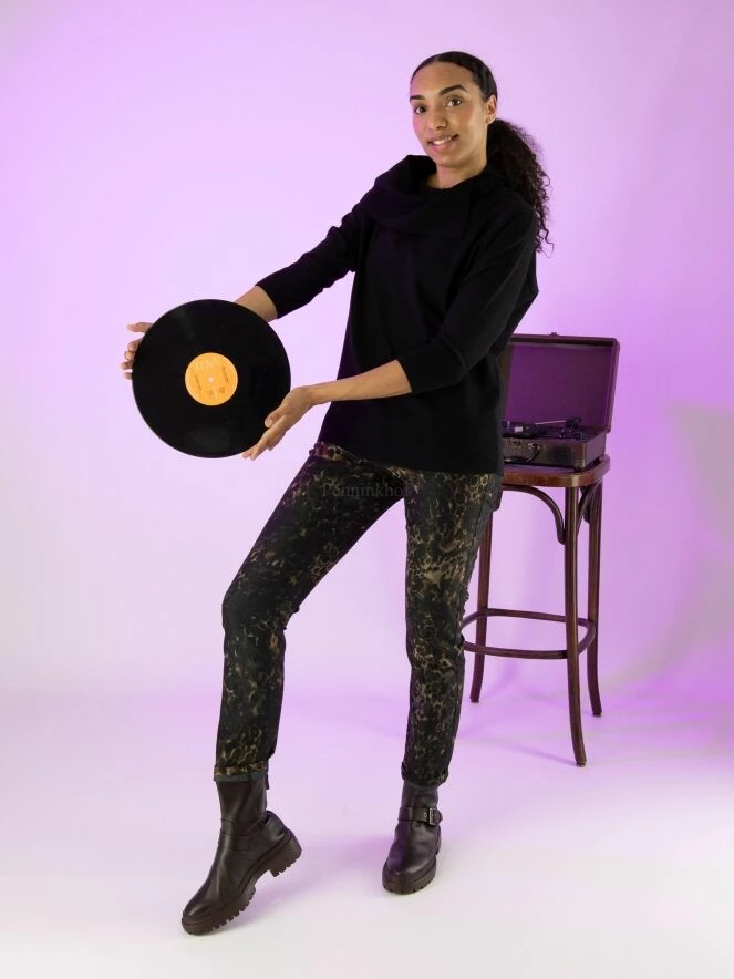 Pantalon de la marque Joseph Ribkoff, à imprimé panthère aux couleurs vert kaki, cognac et beige sur fond noir. La taille est élastiquée. Lavage à la main.