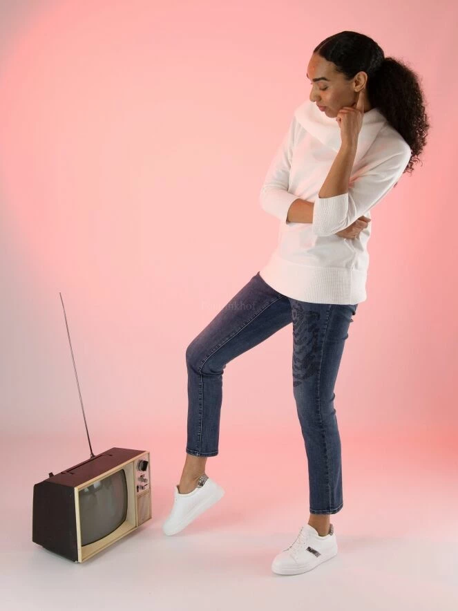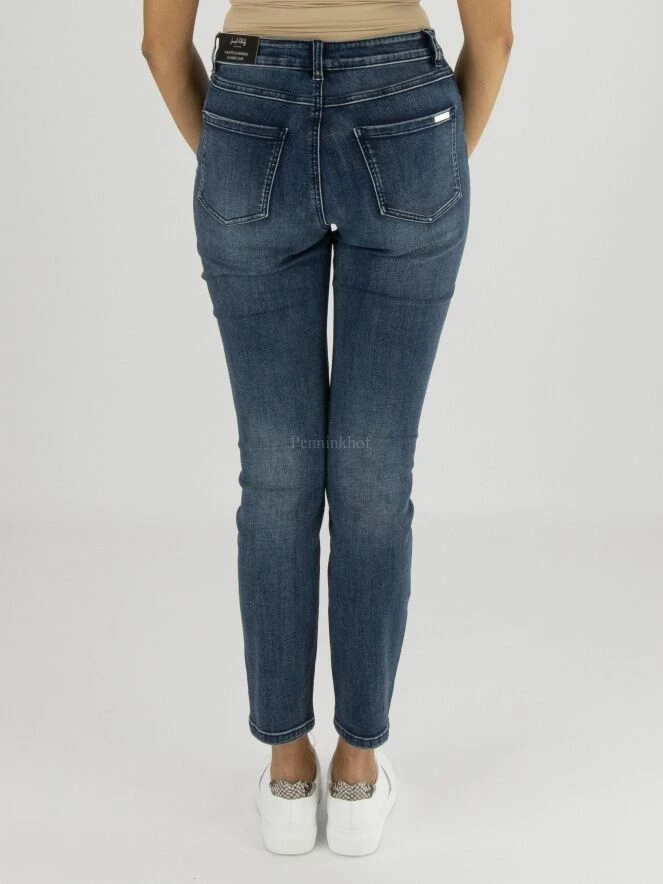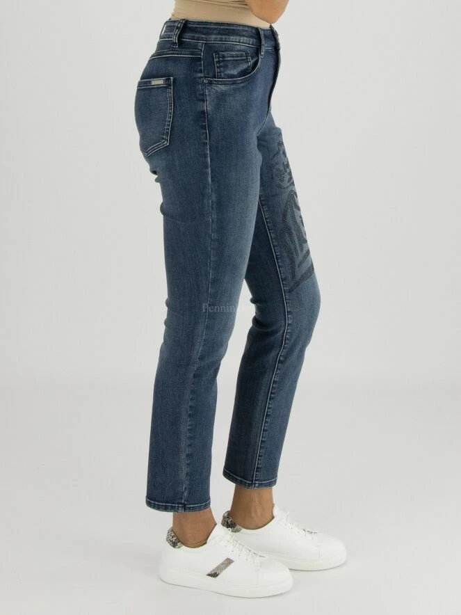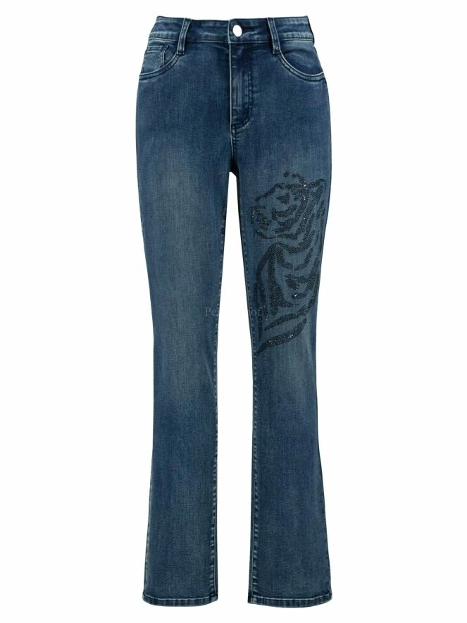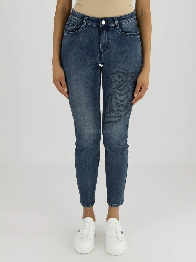Jeans à cinq poches de la marque Joseph Ribkoff, de couleur blue jean basique très légèrement délavé. La cuisse gauche est ornée d’un motif de panthère en strass noir. Lavage à la main.