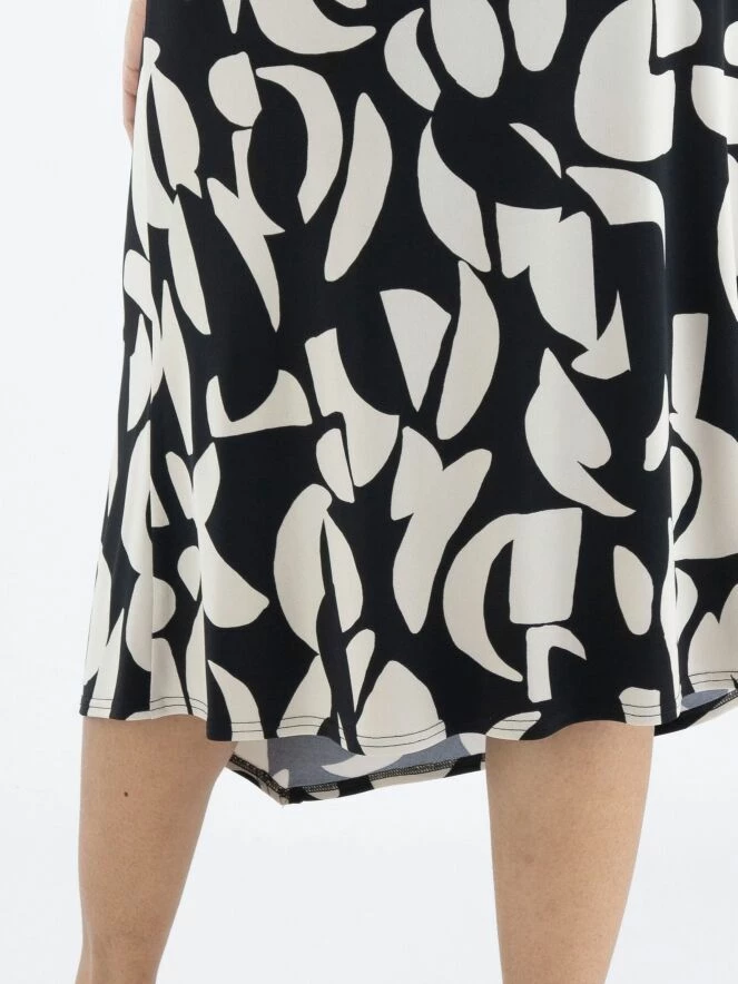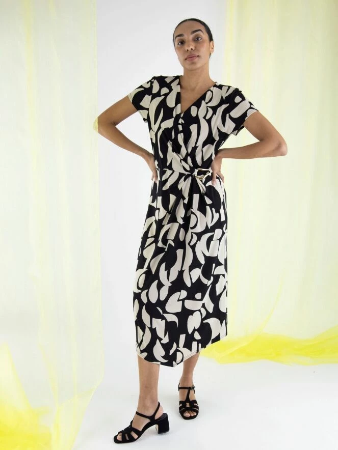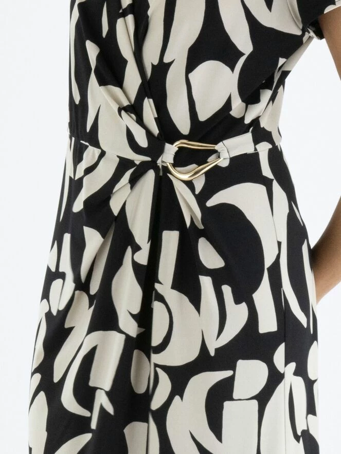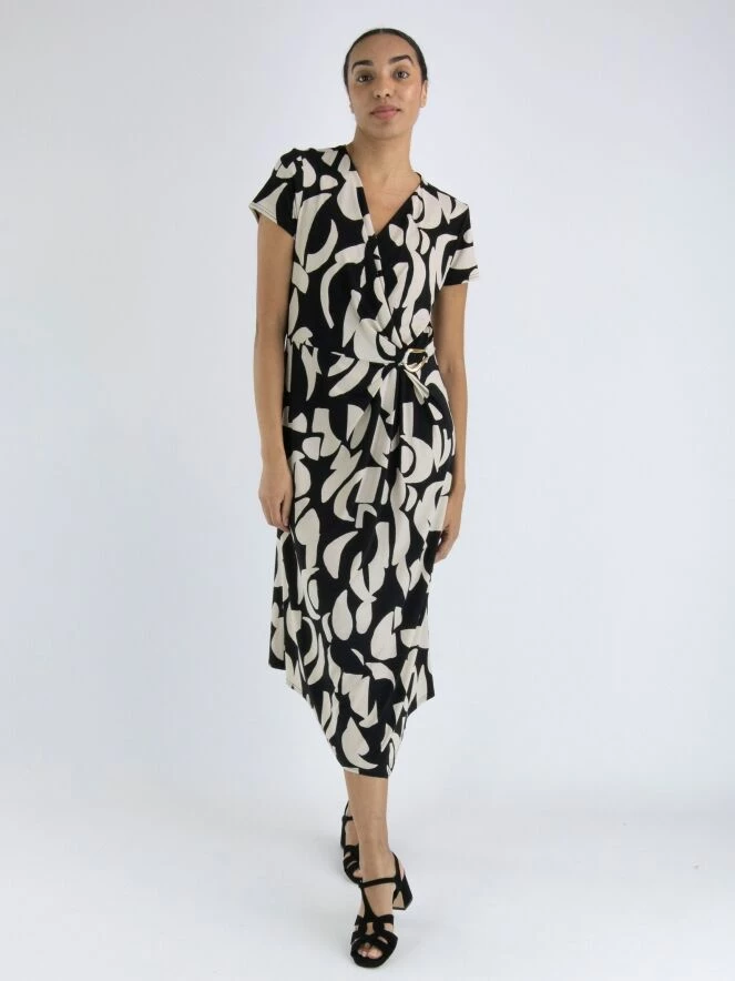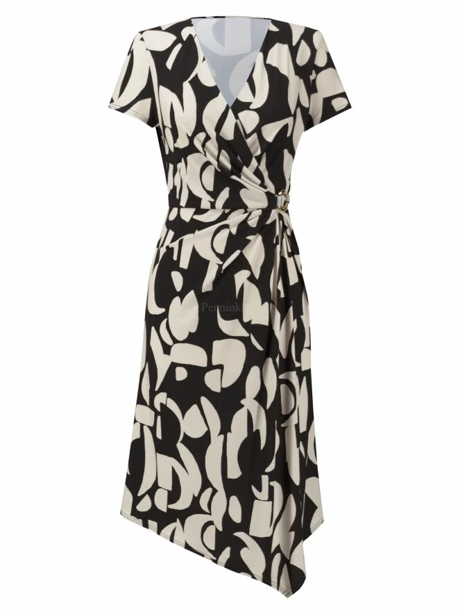 Une robe portefeuille de Joseph Ribkoff avec un imprimé graphique en couleurs sable et noir. Sur le côté gauche de la taille, il y a une boucle décorative dorée d’où le tissu est plissé. La robe a des manches courtes et peut être lavée à la main.