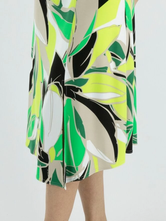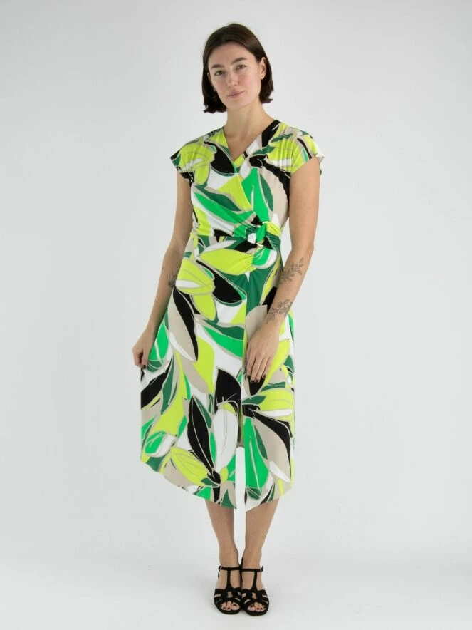 Une robe portefeuille de Joseph Ribkoff avec un imprimé de feuilles en plusieurs nuances de vert, sable, noir et blanc. Sur le côté gauche de la taille, il y a une boucle décorative ronde recouverte du tissu de la robe. Il y a une courte fente en bas de la robe. Cette robe peut être lavée à la main.