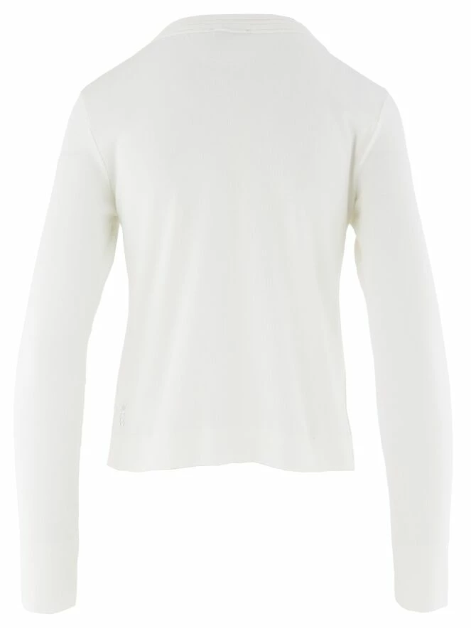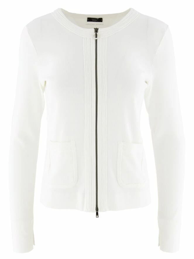 Gilet à manches longues de la marque Marc Cain, de couleur blanc crème. L’avant est doté de petites poches. L’encolure, les bords de la fermeture et des poches sont ornés d’une bordure structurée. Les manches sont fendues et peuvent être retroussées. Lavage à 30 degrés.