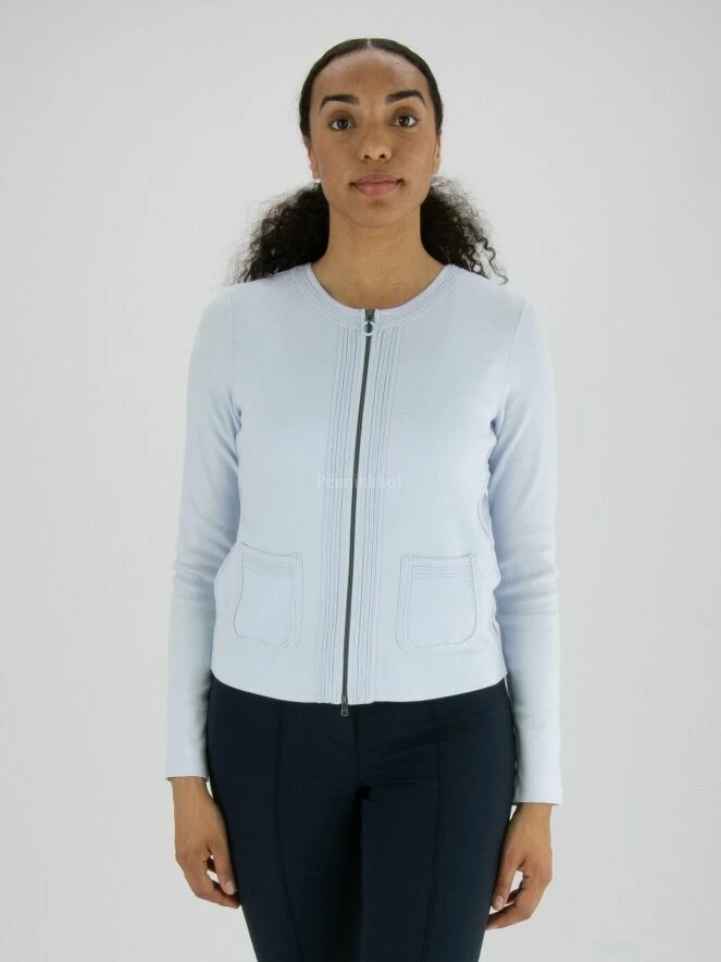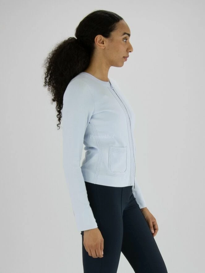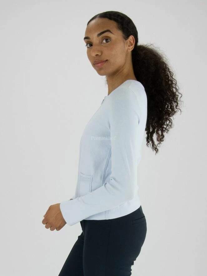 Gilet à manches longues de la marque Marc Cain, de couleur bleu pastel. L’avant est doté de petites poches. L’encolure, les bords de la fermeture et des poches sont ornés d’une bordure structurée. Les manches sont fendues et peuvent être retroussées. Lavage à 30 degrés.