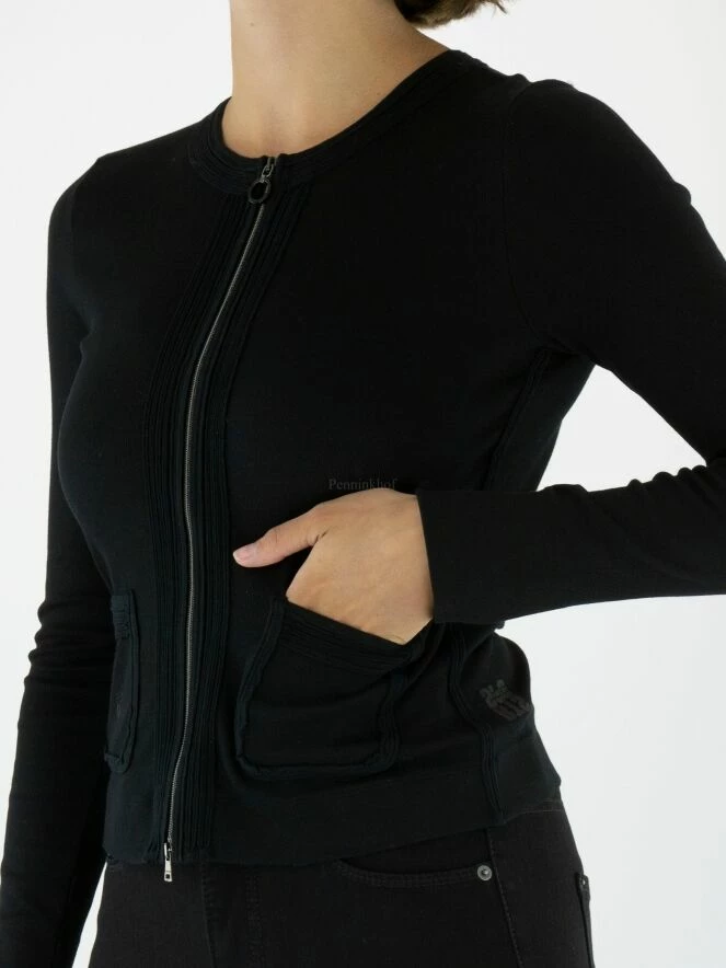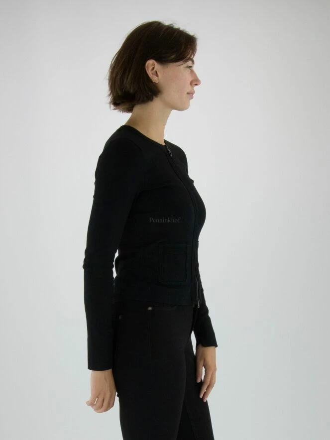 Un cardigan de la marque Marc Cain de couleur noire. Le cardigan a des manches longues et une encolure ronde. Une bande côtelée longe l’encolure et la fermeture à glissière. Une petite fente se trouve à l’extrémité des manches. Ce cardigan peut être lavé à 30 degrés.