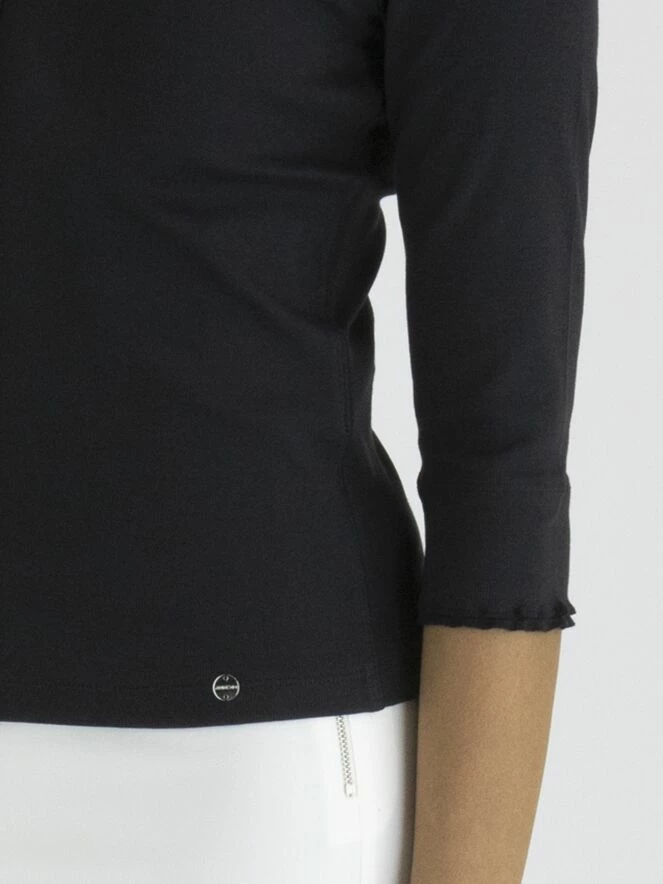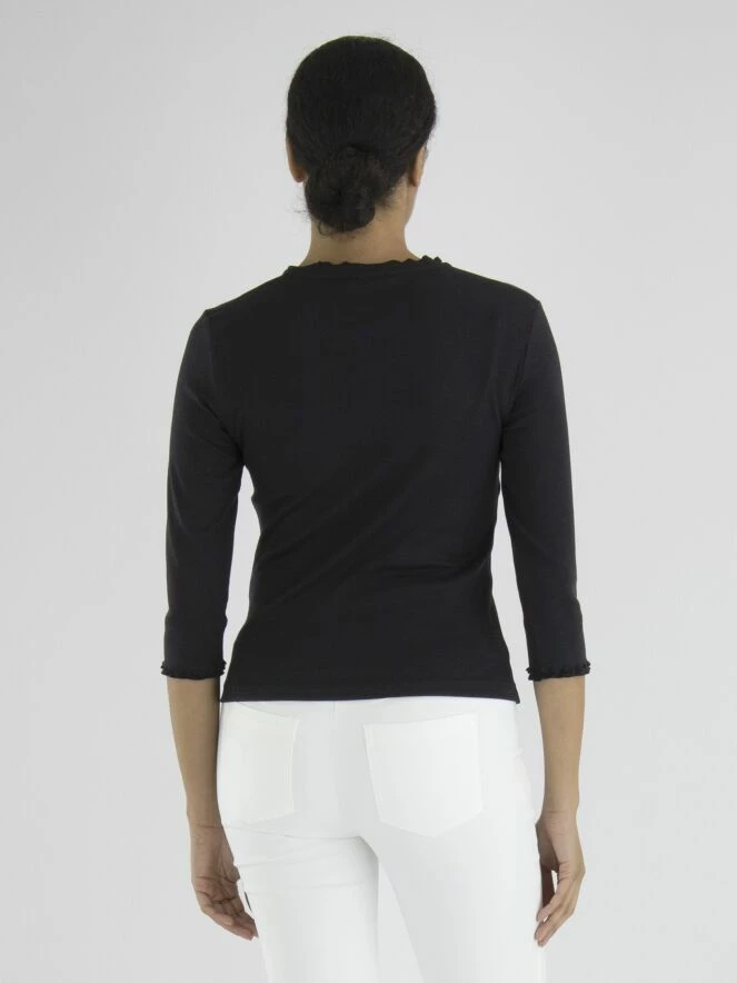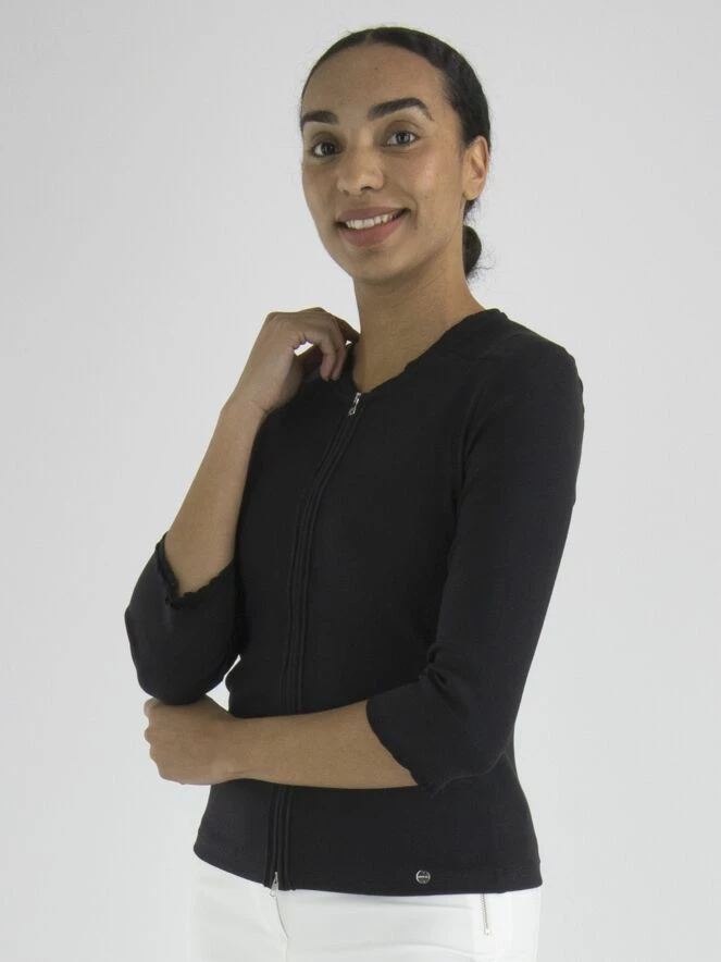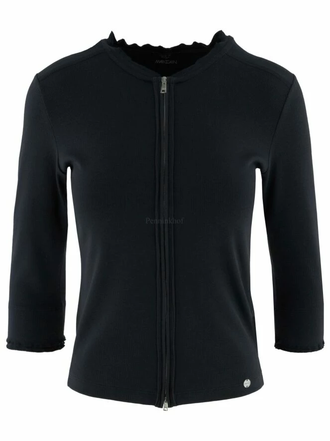 Un gilet de la marque Marc Cain en bleu marine. Le gilet a des manches mi-longues et un col rond. Le long du col et de la fermeture éclair se trouve une bande côtelée. Ce gilet peut être lavé à 30 degrés.