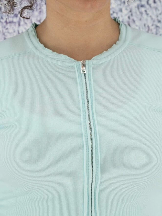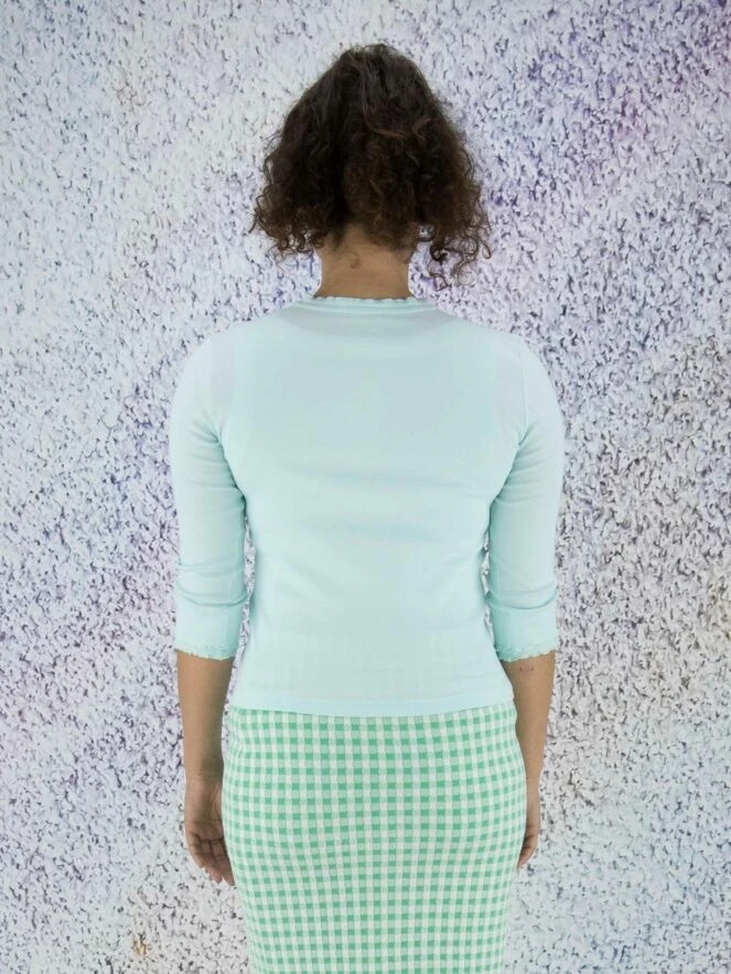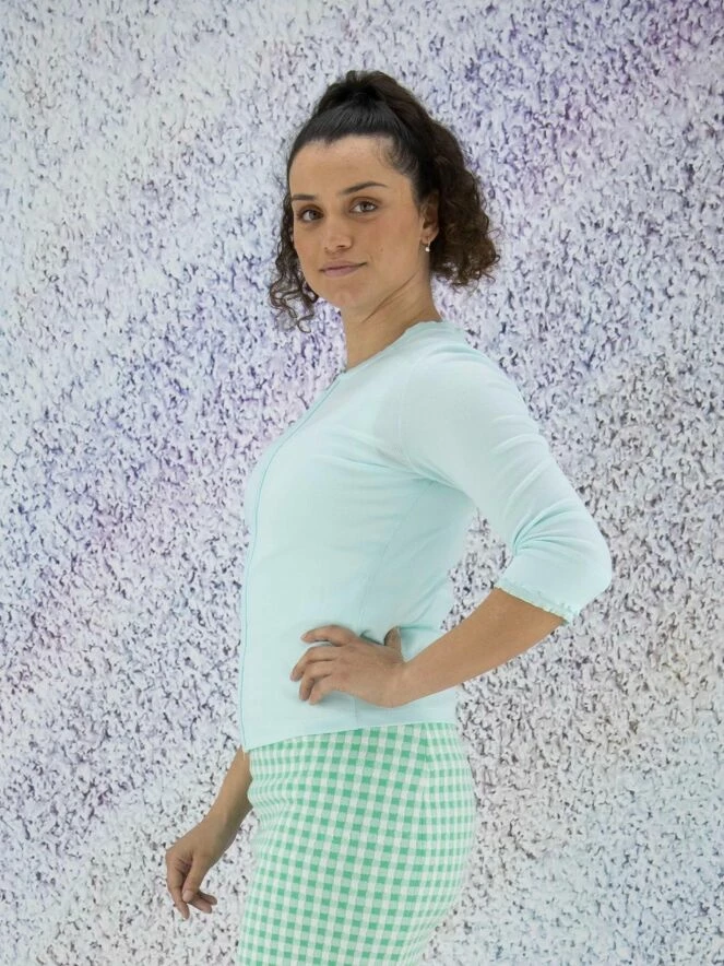 Cardigan de la marque Marc Cain, de couleur vert menthe. Le cardigan présente des manches trois-quart qui se finissent pas un double tissu légèrement ondulé. L’encolure ronde s’ouvre sur une fermeture Eclair à double curseur bordée d’une bande en relief lègèrement ondulé. Lavage à 30 degrés.
