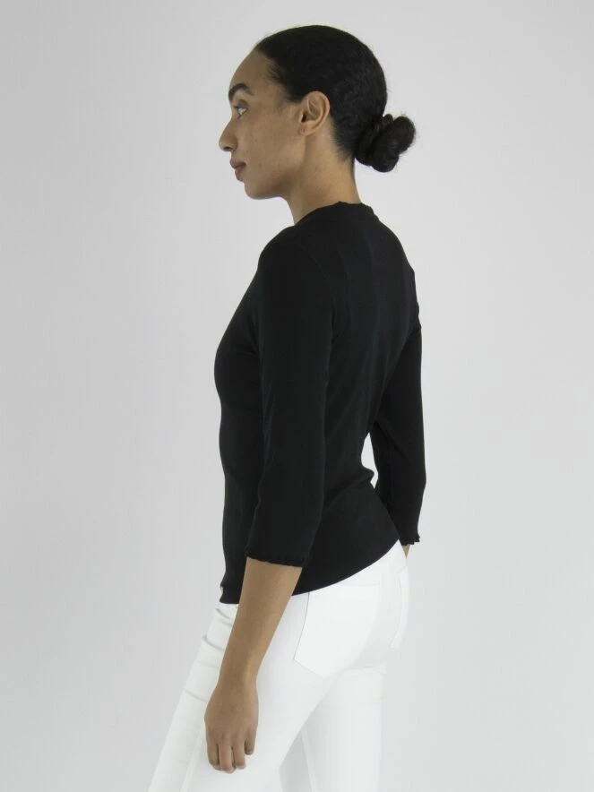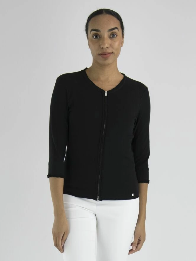Un gilet de la marque Marc Cain en noir. Le gilet a des manches mi-longues et un col rond. Le long du col et de la fermeture éclair se trouve une bande côtelée. Ce gilet peut être lavé à 30 degrés.