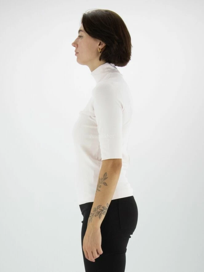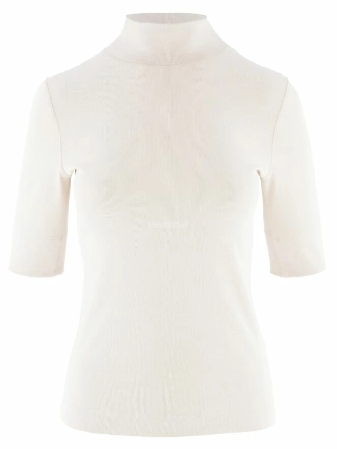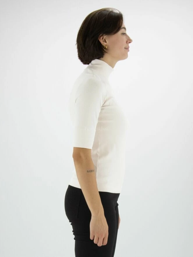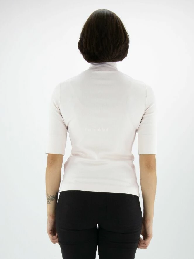 Un T shirt de Marc Cain dans la couleur nude. ce shirt a des manches courtes et un col roulé. Ce T shirt peut être lavée à 30 degrés.