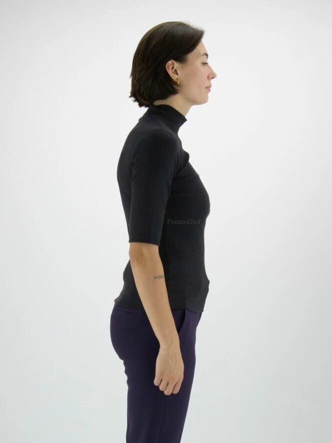 Un T-shirt de Marc Cain en bleu marine. Le shirt a des manches courtes et un col roulé. Ce T shirt peut être lavée à 30 degrés.