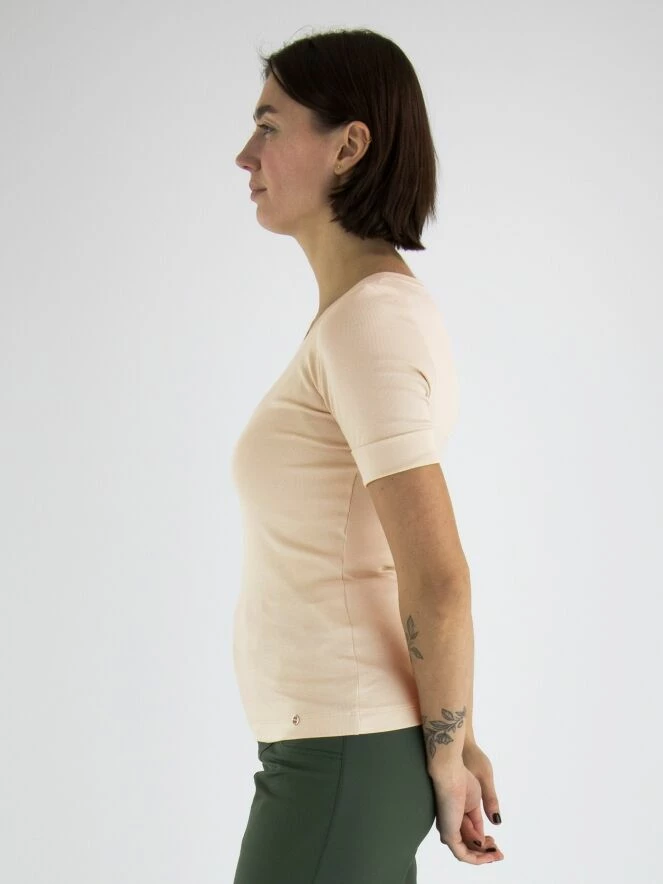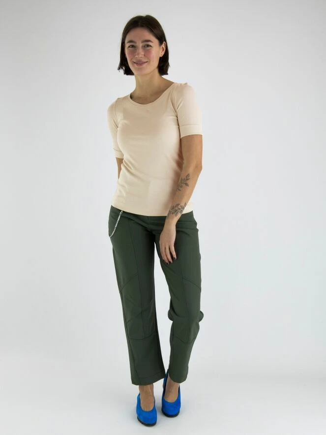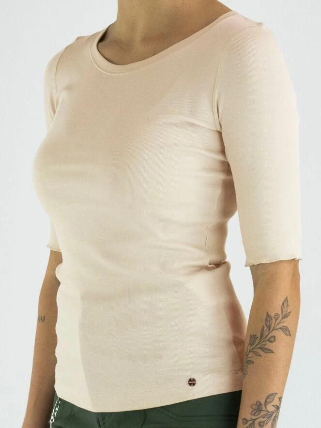 Un chemisier de Marc Cain en sable. Les manches courtes ont un revers. Le chemisier a un col rond et peut être lavé à 30 degrés.