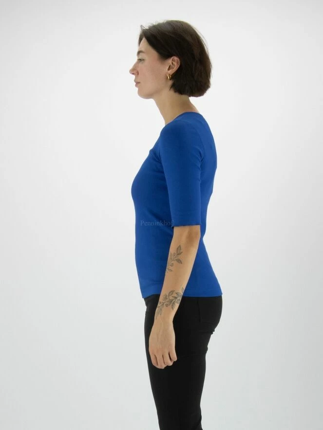 T shirt de Marc Cain en bleu cobalt. Les manches courtes sont retroussées. Le T – shirt a un col rond et peut être lavée à 30 degrés.