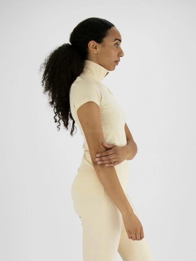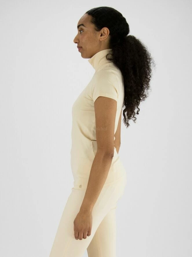 Tee-shirt à manches courtes de la marque Marc Cain, de couleur sable. Le tee-shirt présente un col montant refendu sur l’avant. Des passepoils ornent le bas du col et des emmanchures. Lavage à 30 degrés.