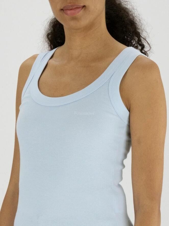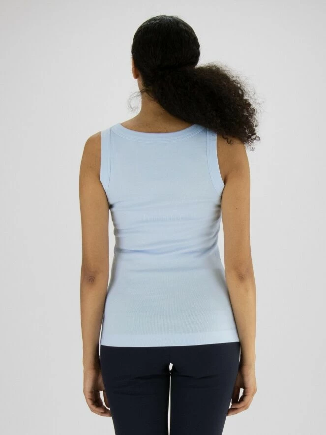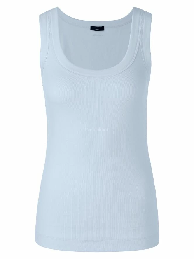 Débardeur à col rond de la marque Marc Cain, de couleur bleu pastel. Le col et les emmanchures sont bordés d’un large passepoil. Lavage à 30 degrés.