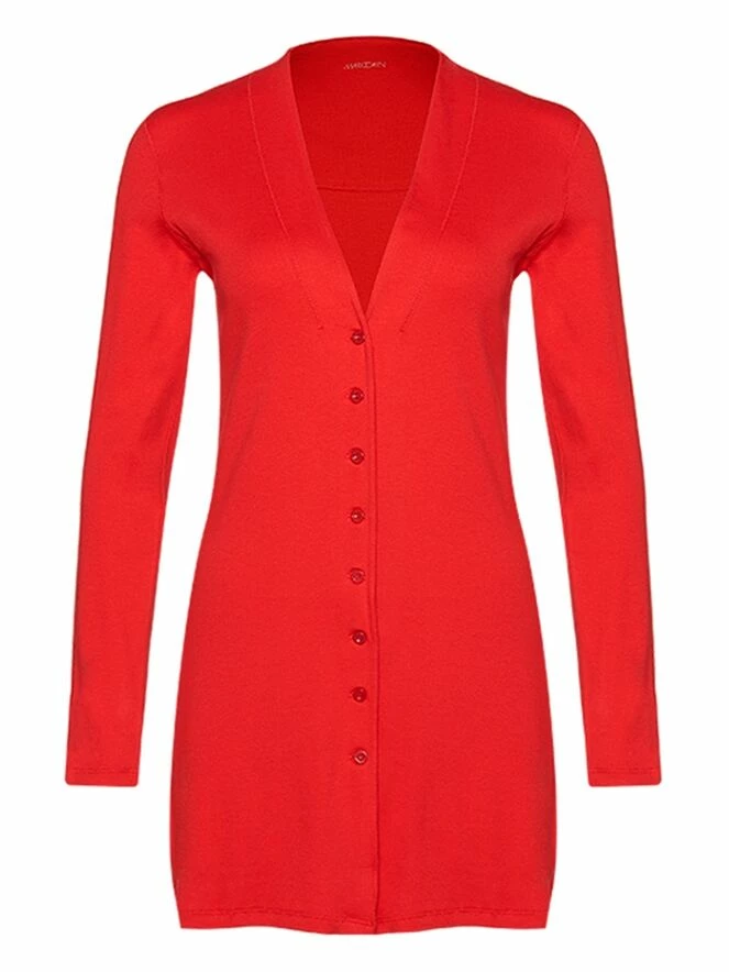Gilet basique de coupe longue, de la marque Marc Cain essentiels, de couleur rouge. Il se ferme par de petits boutons de même couleur. Décolleté sobre en V. Ce modèle est facile à combiner et s’accorde à tous les types de garde-robe. Lavage à 30 degrés.
