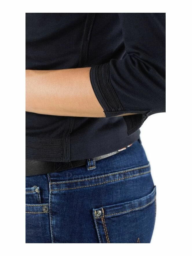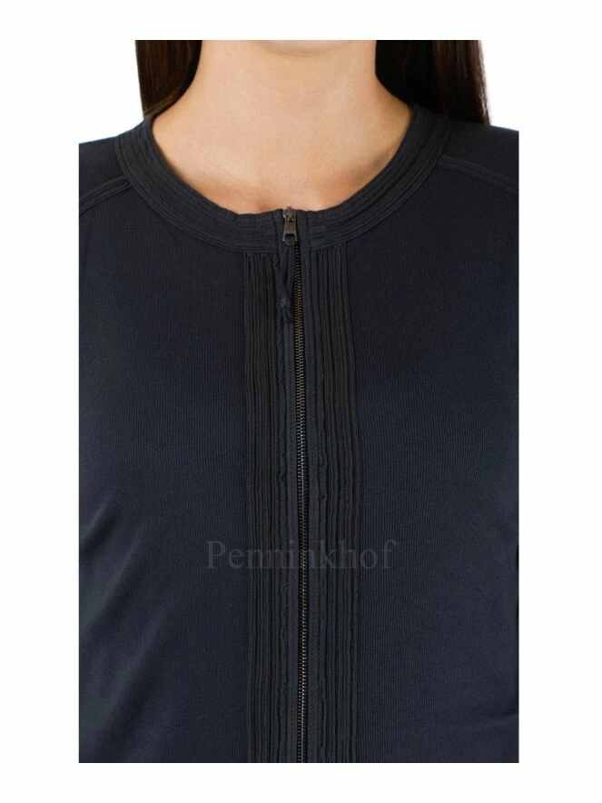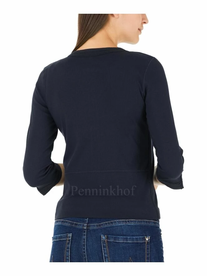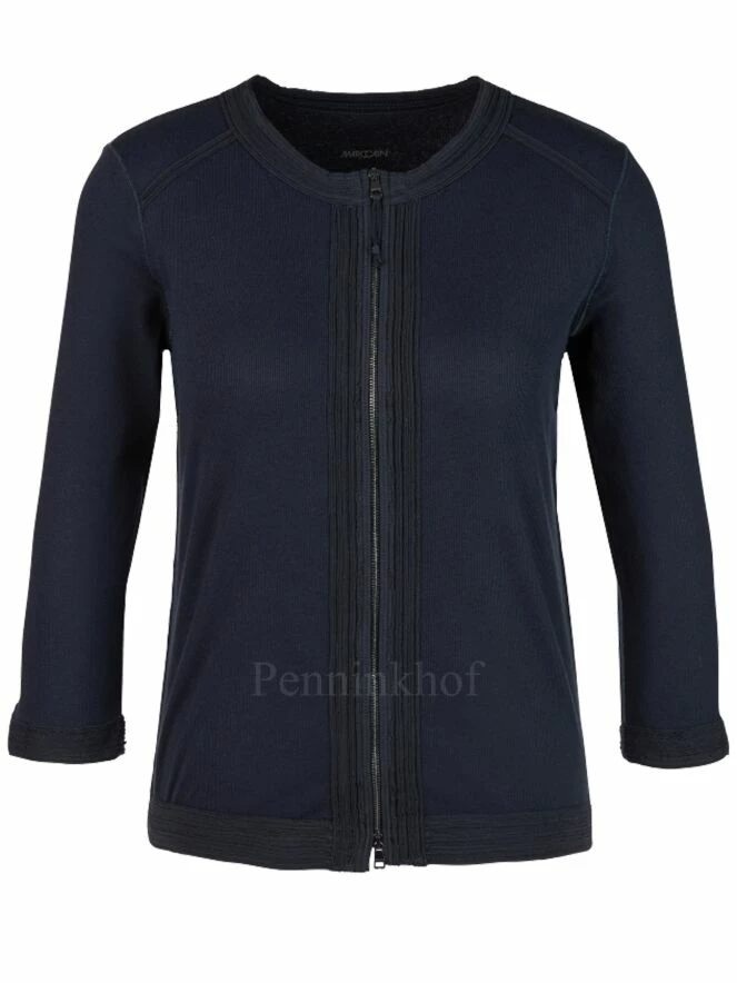 Cardigan de coupe droite, de la marque Marc Cain essentiels, de couleur bleu marine. Le cardigan présente des manches mi-longues et un col ras du cou. Les passepoils roulants ressortissant aux manches, de part et d’autre de la fermeture Eclair et du col affirment sa personnalité. Lavage à 30 degrés.