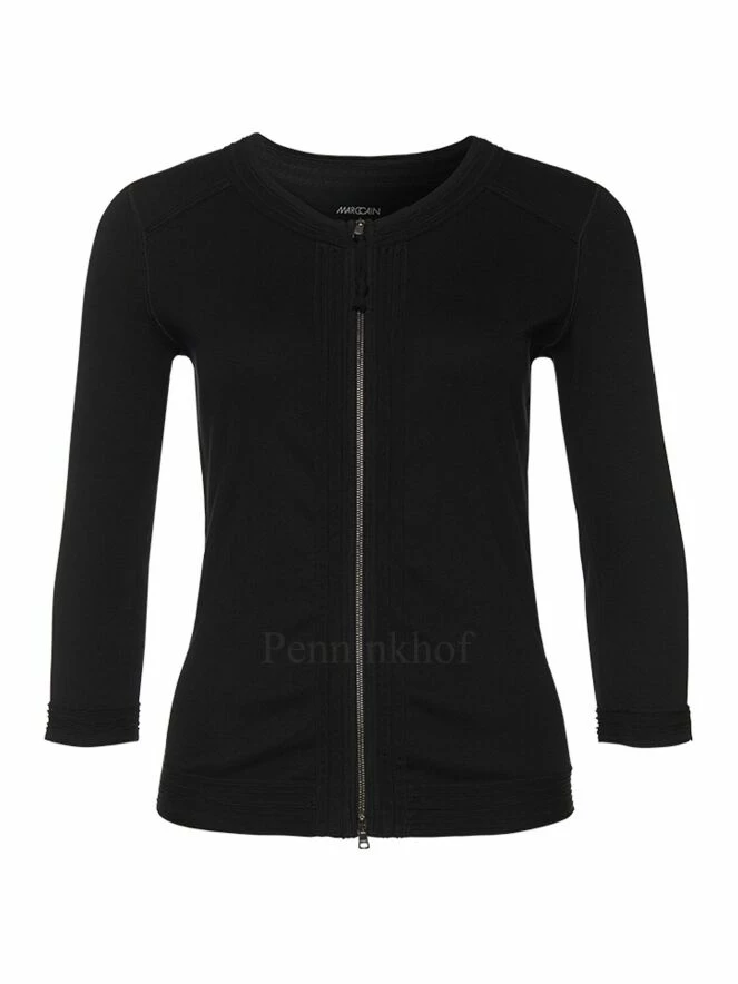 Cardigan de coupe droite, de la marque Marc Cain essentiels, de couleur noir. Le cardigan présente des manches mi-longues et un col ras du cou. Les passepoils roulants ressortissant aux manches, de part et d’autre de la fermeture Eclair et du col affirment sa personnalité. Lavage à 30 degrés.