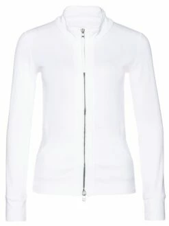 Gilet court à manches longues, de la marque Marc Cain, de couleur blanche. L’ouverture de ses deux poches latérales sur le devant sont arrondies. Modèle à fermeture Eclair double sens bordée d’une simple bande remontant jusqu’au col double épaisseur. Lavage à 30 degrés.