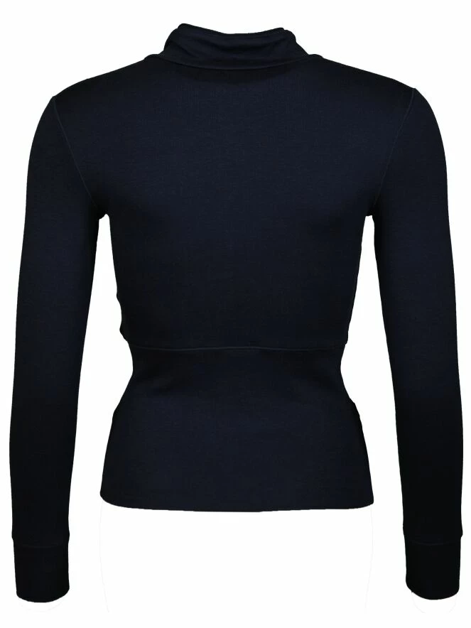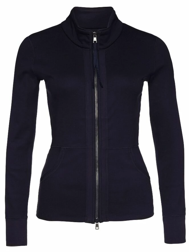 Gilet court à manches longues, de la marque Marc Cain, de couleur bleu marine. L’ouverture de ses deux poches latérales sur le devant sont arrondies. Modèle à fermeture Eclair double sens bordée d’une simple bande remontant jusqu’au col double épaisseur. Lavage à 30 degrés.