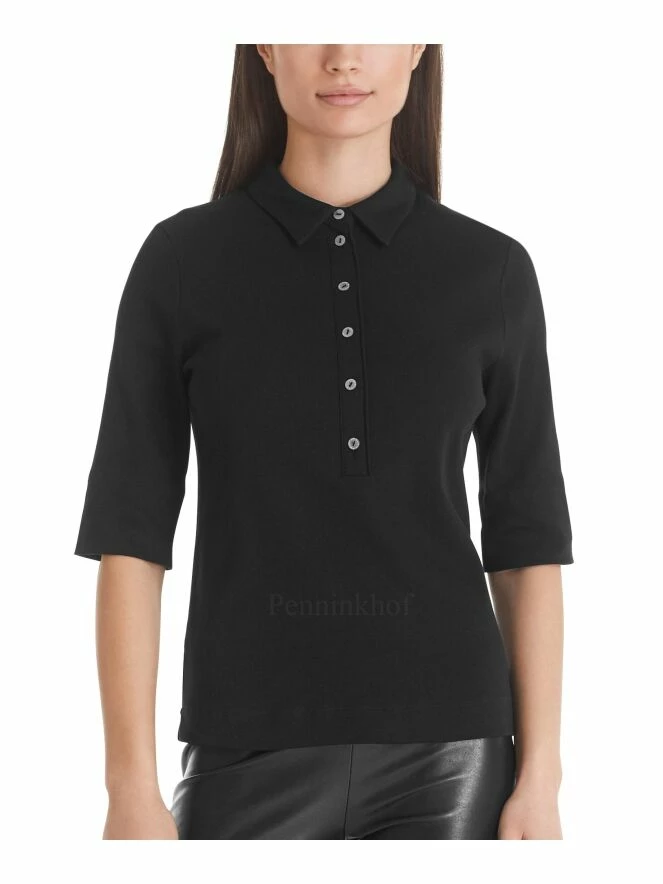 Polo de la marque Marc Cain, de couleur noire. La chemise présente des manches mi-longues à retrousser et une longue patte de boutonnage à boutons brillants. Lavage à 30 degrés.