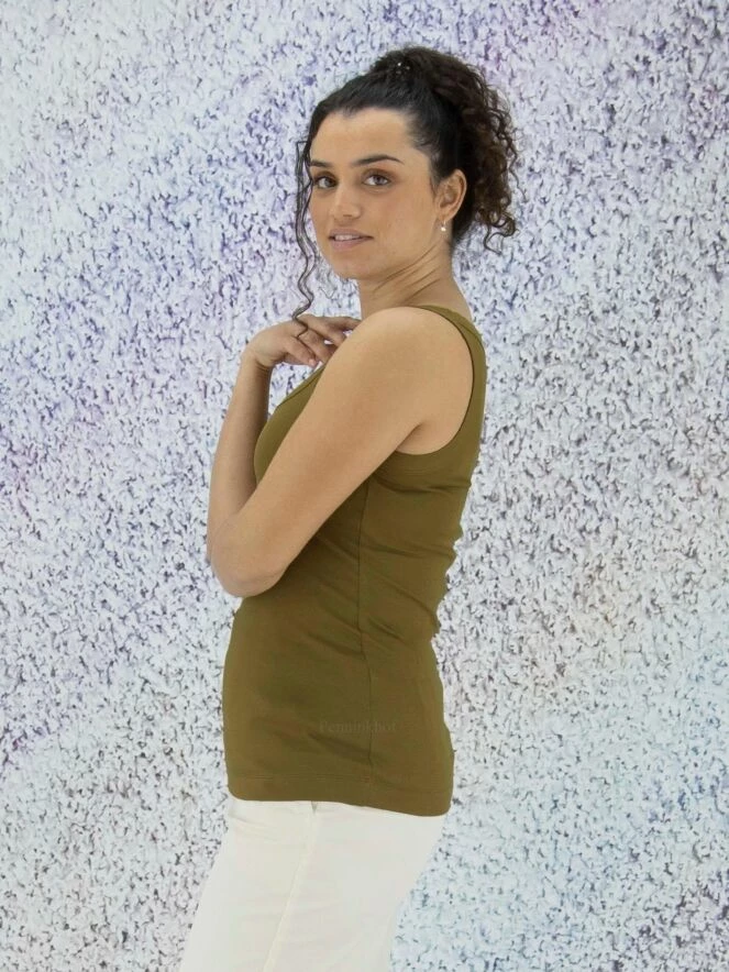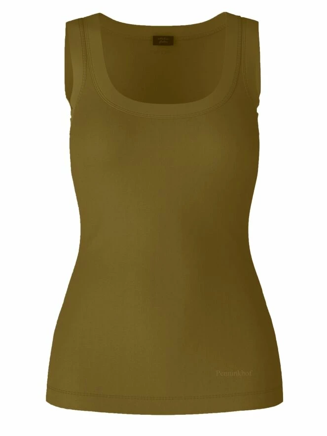 Débardeur finement côtelé de la marque Marc Cain, de couleur vert olive. Il présente un col rond. Lavage à 30 degrés.