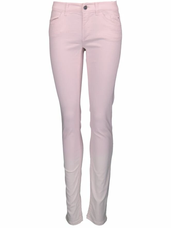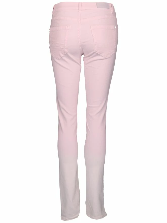 Pantalon slim de couleur rose pâle avec un dégradé blanc crème vers le bas, de la marque Marc Cain. Modèle à cinq poches. Lavage à 30 degrés.