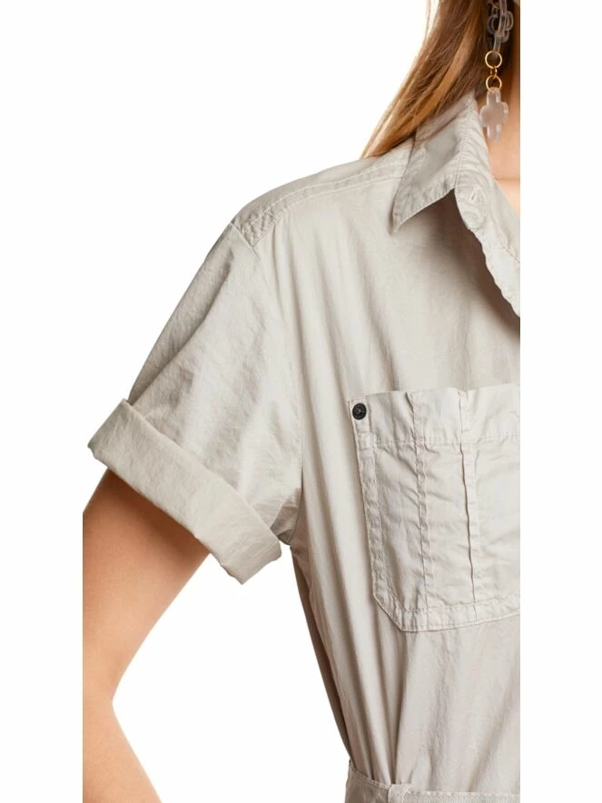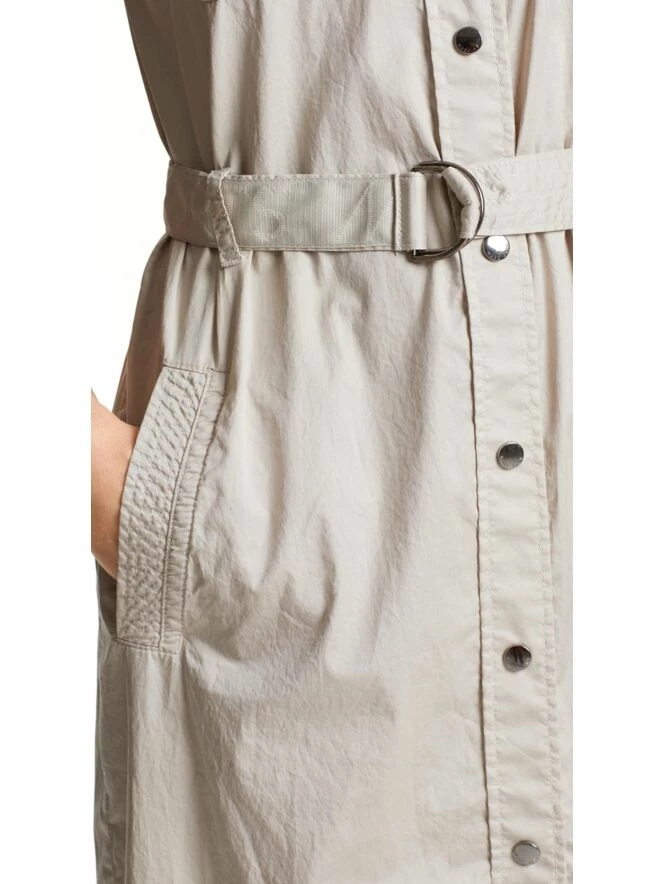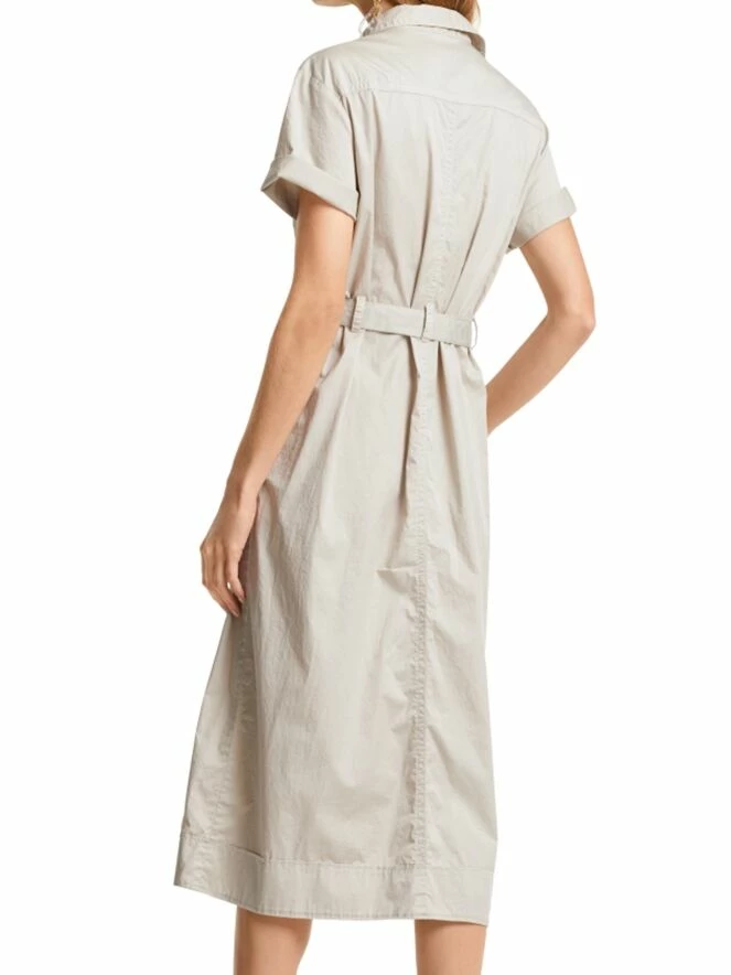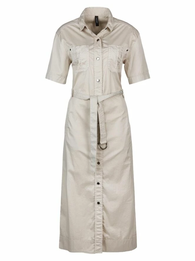Robe à manches courtes, de la marque Marc Cain, de couleur sable. Cette robe est munie de boutons-pression argentés sur le devant et de poches poitrine. Elle est équipée de poches latérales et d’une ceinture faite de la même matière accentuant la taille. Lavage à 30 degrés.