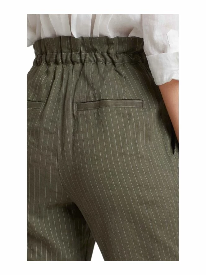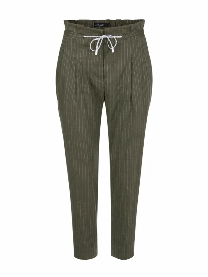 Pantalon de la marque Marc Cain, à fines rayures blanches sur un fond vert olive. La taille haute est munie d’un cordon coulissant au look sportif. Ce pantalon à rayures tennis, doté de pinces et de quatre poches, est très agréable à porter. Lavage à 30 degrés.