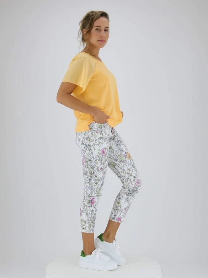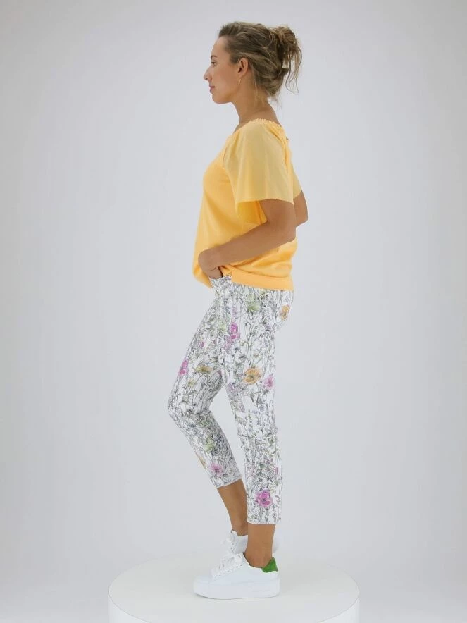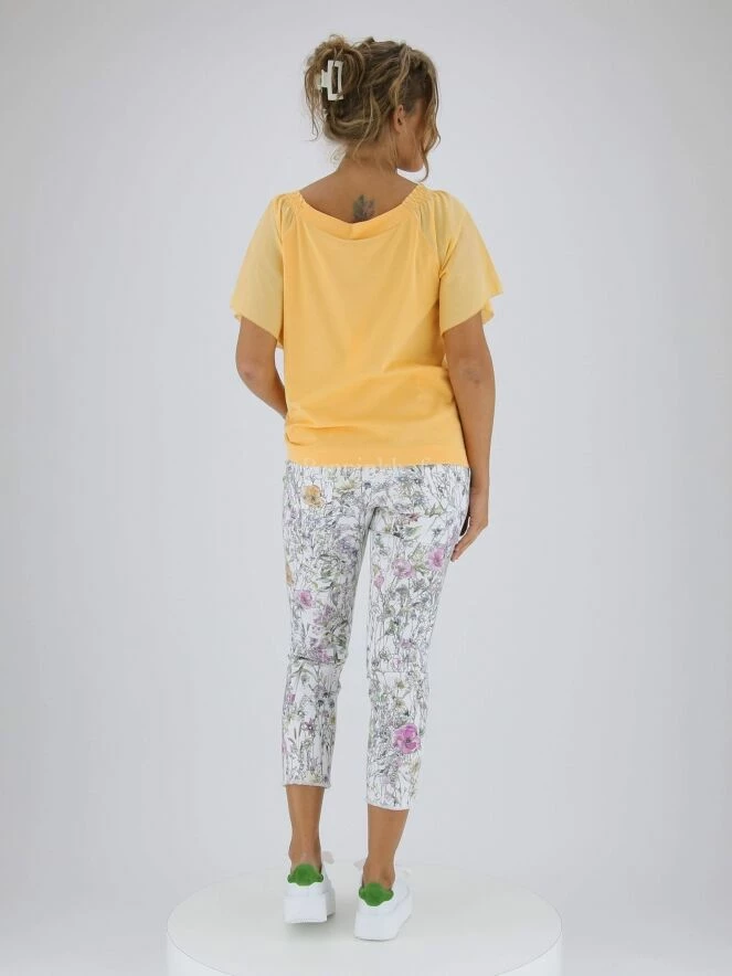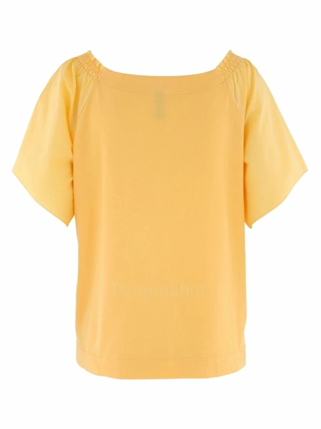 Tee-shirt à manches papillon de la marque Marc Cain, de couleur mandarine. Le col carré est muni de fronces élastiques aux épaules. Lavage à 30 degrés.