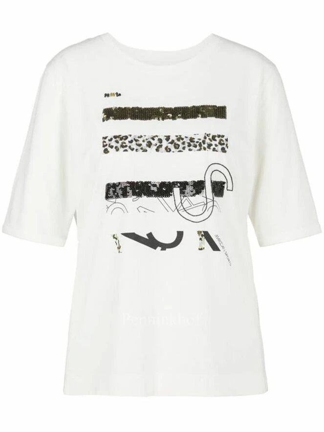 Tee-shirt de la marque Marc Cain, de couleur blanche. Il est orné sur le devant de bandes à paillettes noires, vertes et un imprimé panthère. Lavage à 30°C.