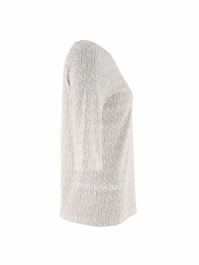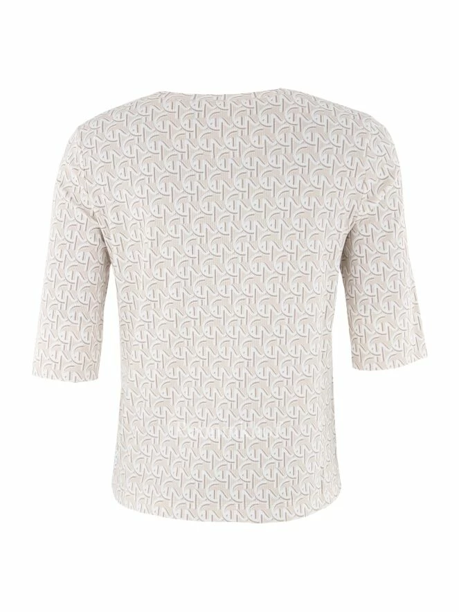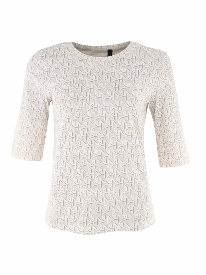 Tee-shirt de la marque Marc Cain, à motif de lettres entrelacées de façon artistique aux couleurs chair, blanc et taupe clair. Le t-shirt présente un col rond et des manches courtes. Lavage à 30 degrés.