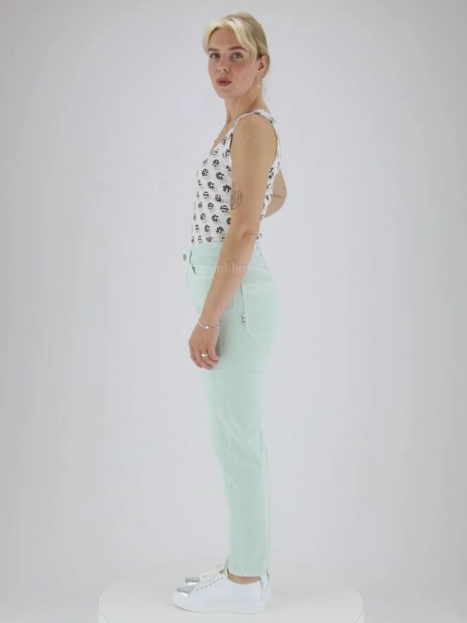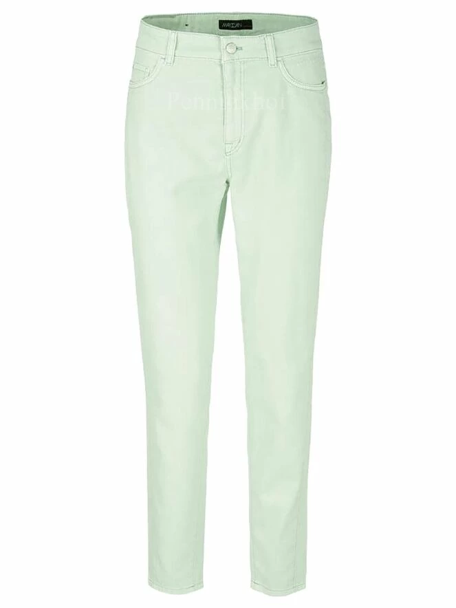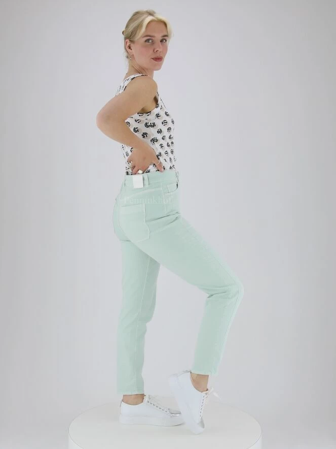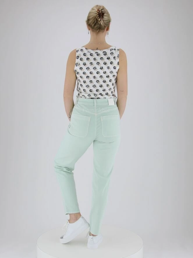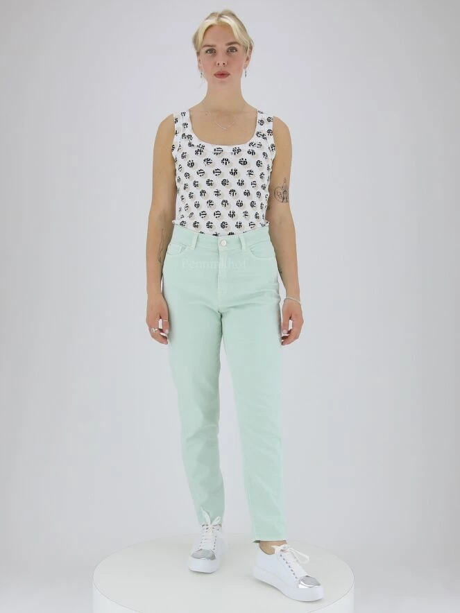 Jeans à taille haute de la marque Marc Cain, de couleur vert menthe. Le jean est un modèle à 5 poches basique et peut être lavé à 30 degrés.