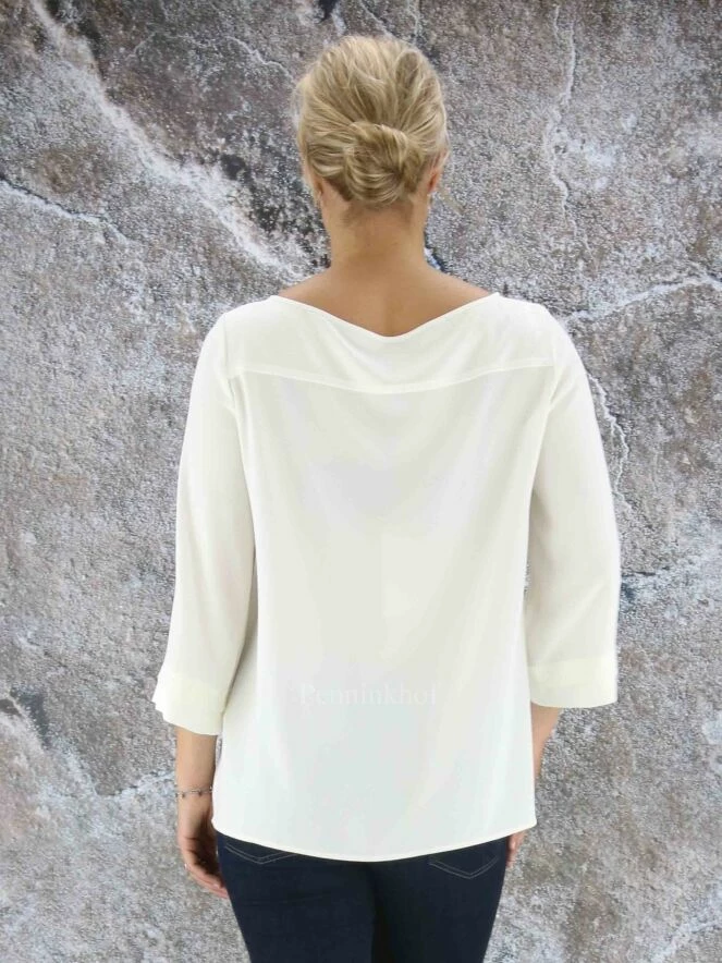 Tee-shirt-chemise légèrement transparente de la marque Marc Cain, de couleur blanc crème. La chemise présente un large col ras du cou et des manches trois-quarts. Une surpiqûre horizontale décorative orne le dessus du buste. Lavage à 30 degrés.