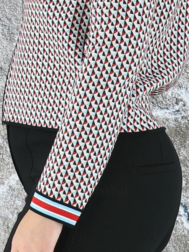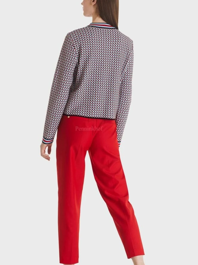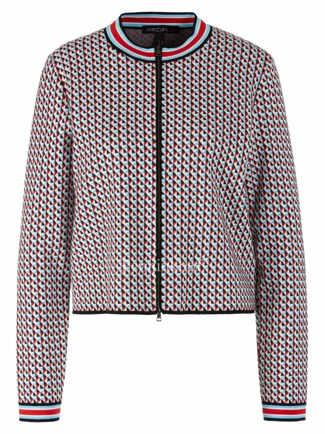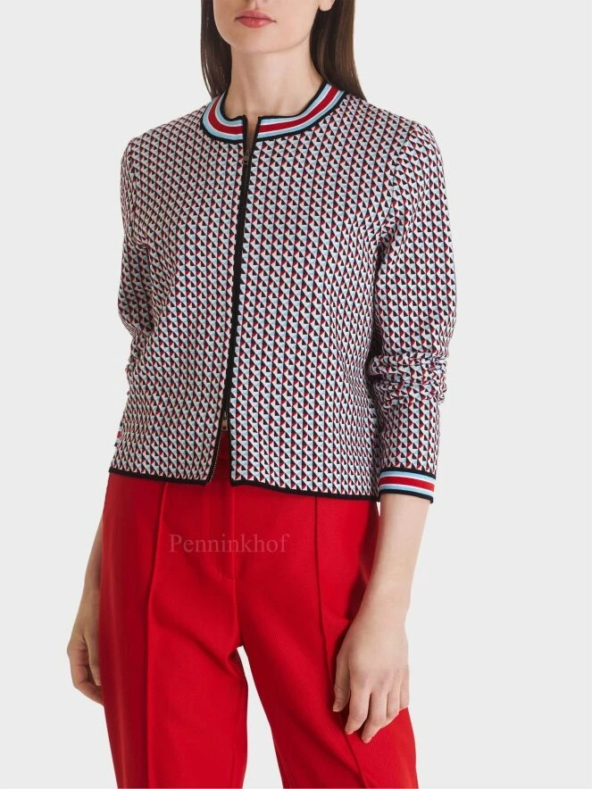 Gilet court de la marque Marc Cain, à imprimé mosaïque aux couleurs rouge, noir, bleu et blanc crème. Le bord de l’encolure ras du cou et le bout des manches longues sont garnis de jersey à motif de couleur rayé. Le gilet ferme à l’aide d’une fermeture Eclair noire. Lavage à 30 degrés.