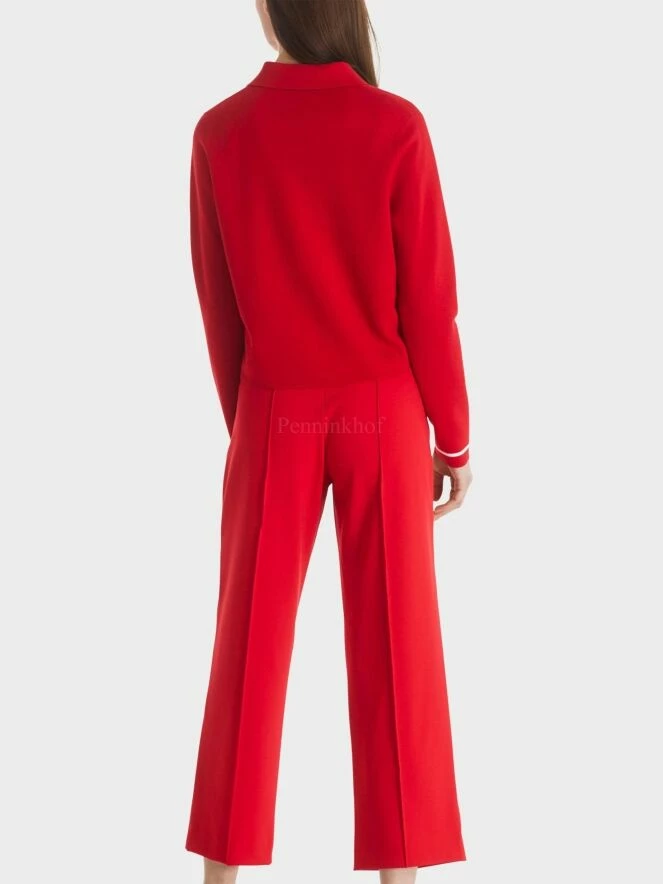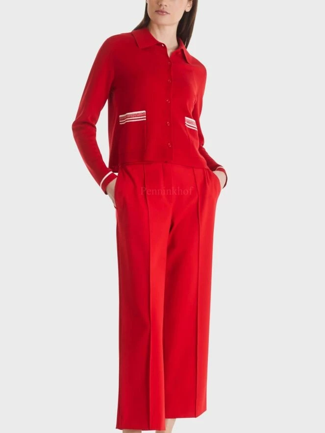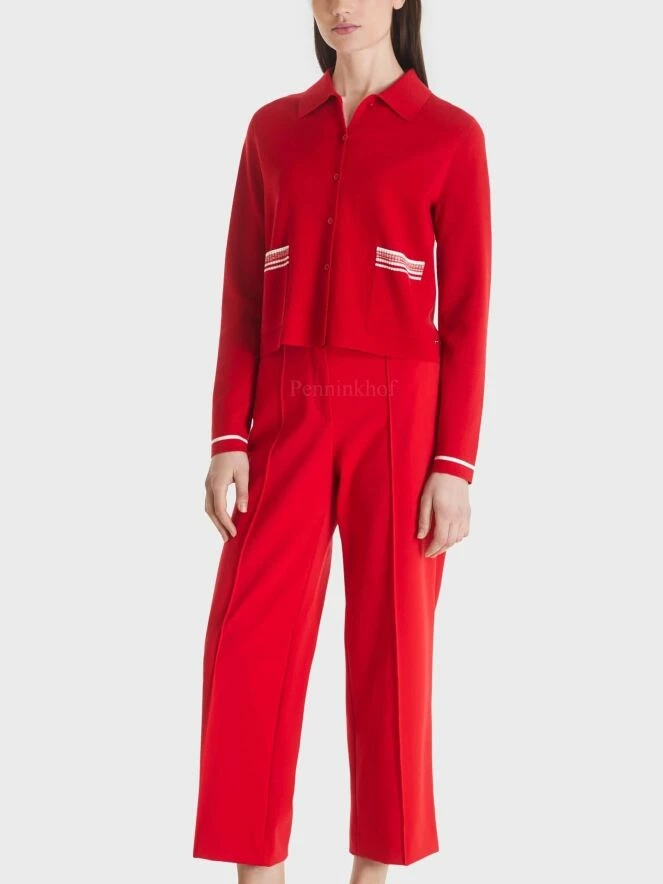 Cardigan court de la marque Marc Cain, de couleur rouge. Il est doté d’un col chemise et d’une patte de boutonnage qui ferme par un bouton haut. Les rayures de couleur contrastante en fin jersey côtelé sur les poches plaquées avant et au bas des manches apportent une belle touche de style. Lavage à 30 degrés.