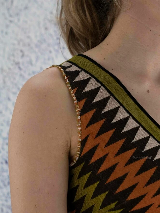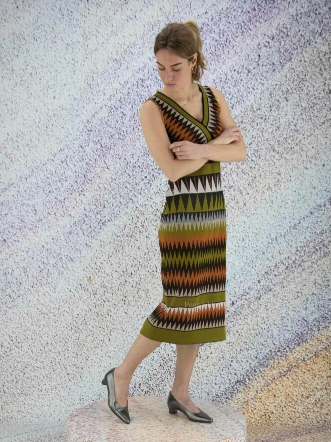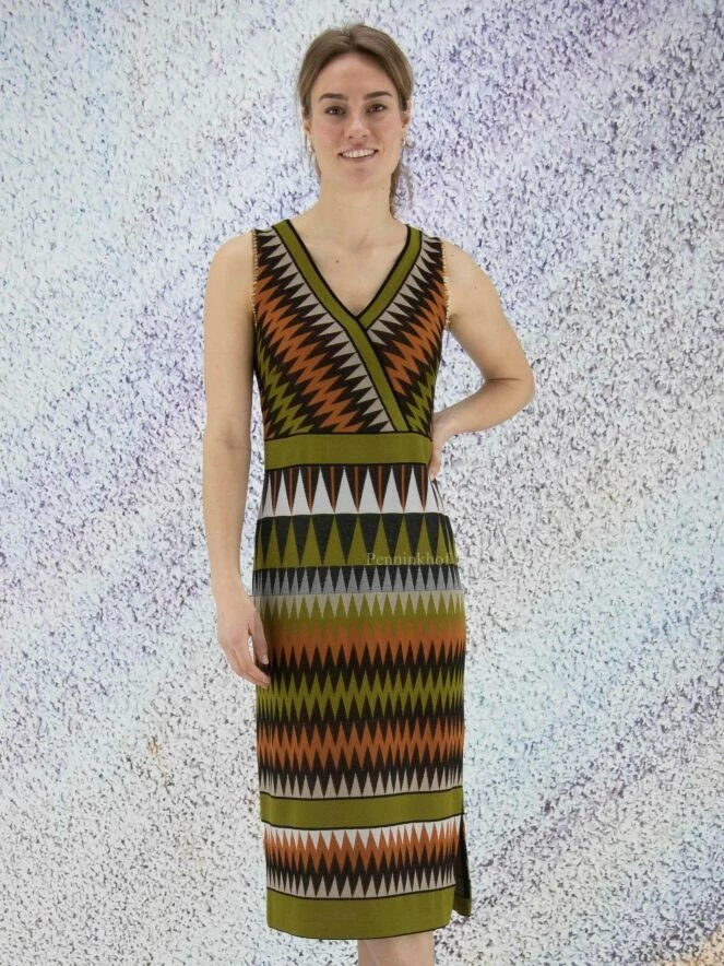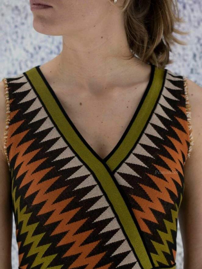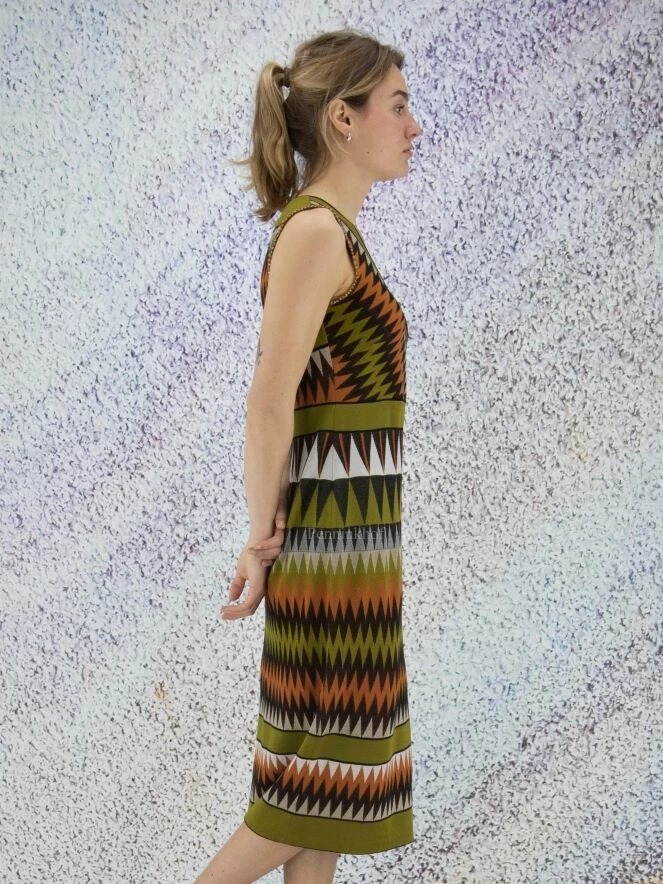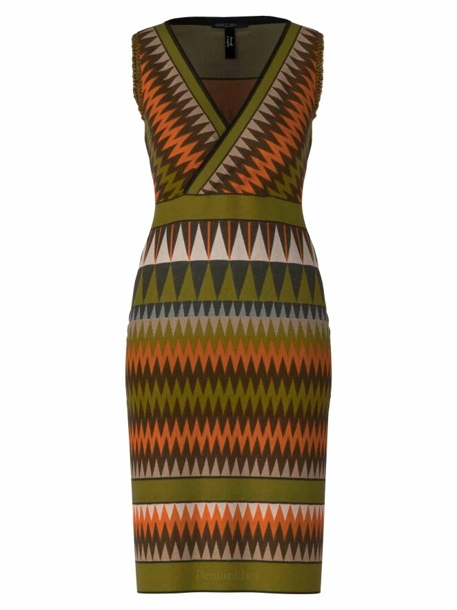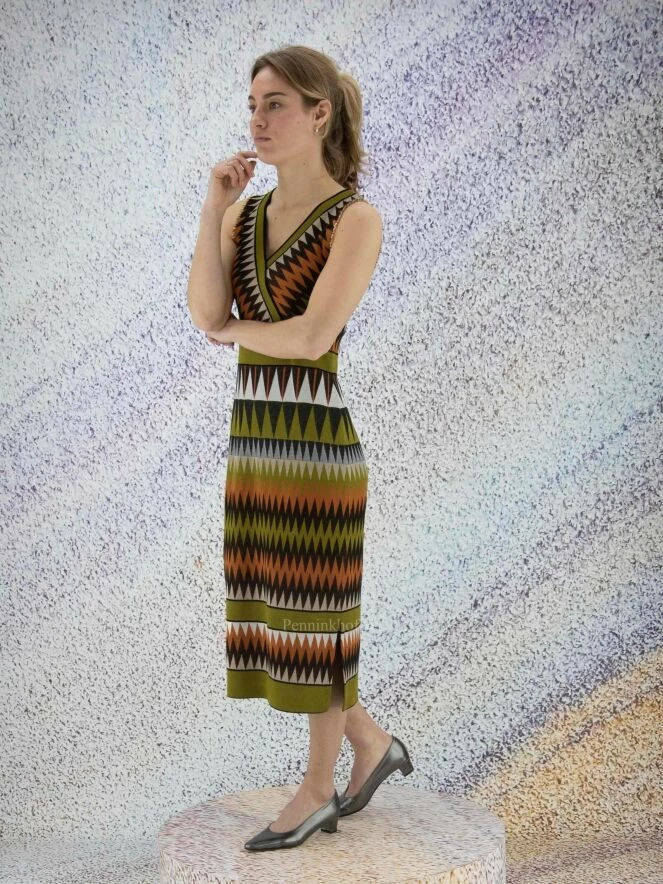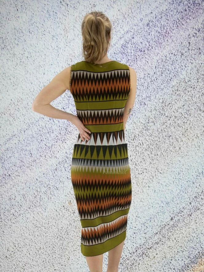 Robe sans manches de la marque Marc Cain, imprimée de lignes en zigzag graphique aux couleurs vert pistache, orange, blanc crème et noir. La robe présente un col en V. Les emmanchures sont bordées de fines franges. Lavage à 30 degrés.