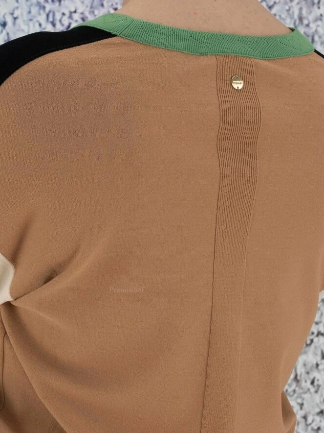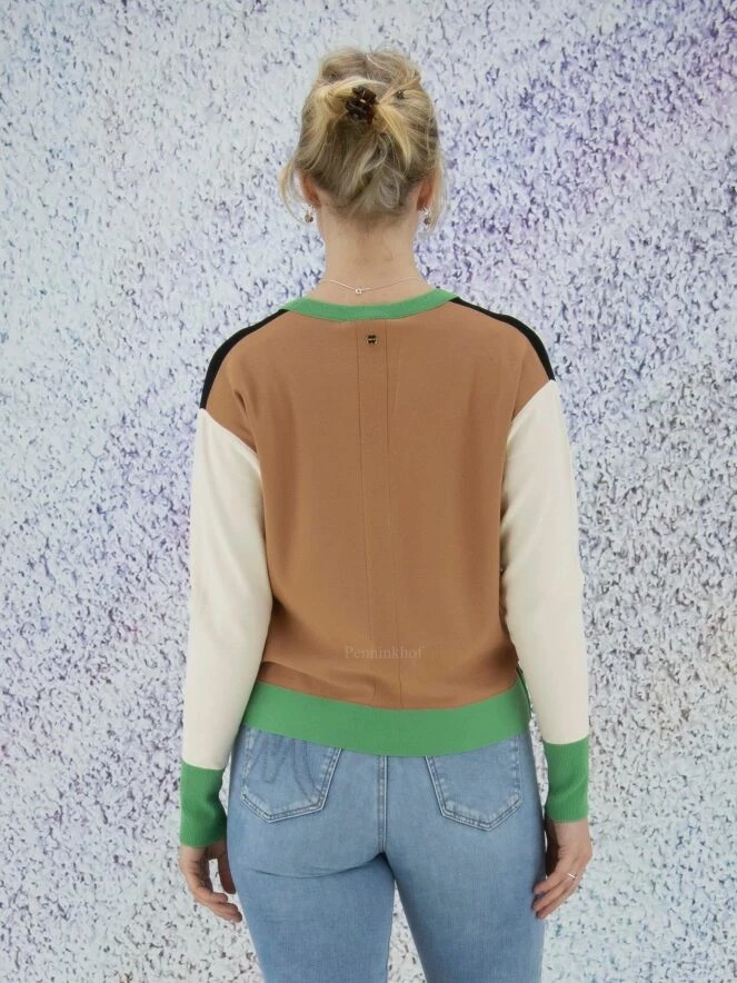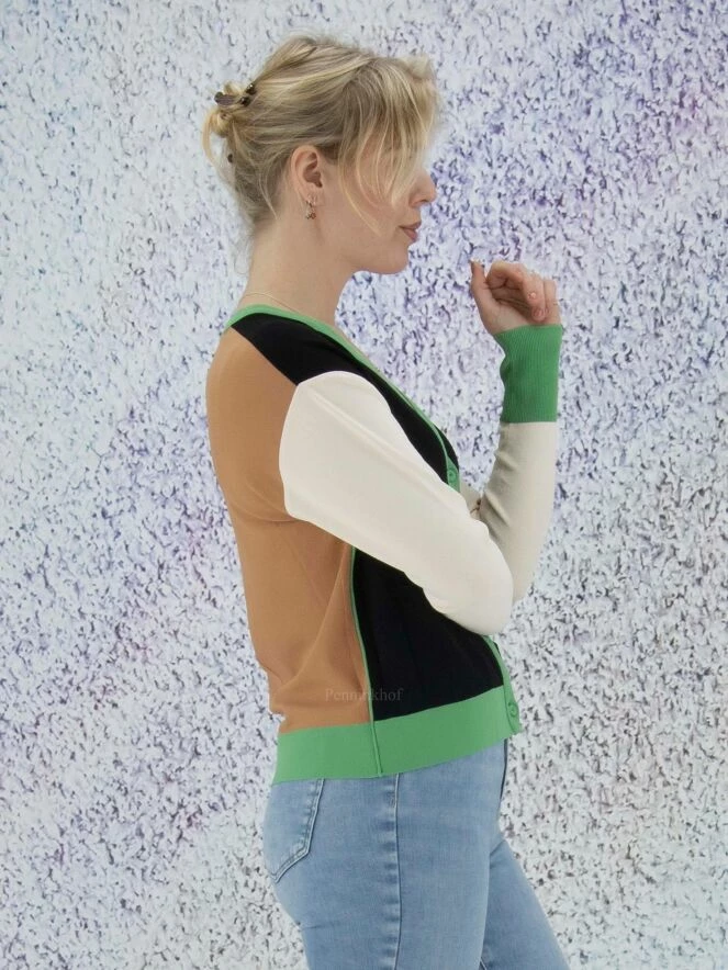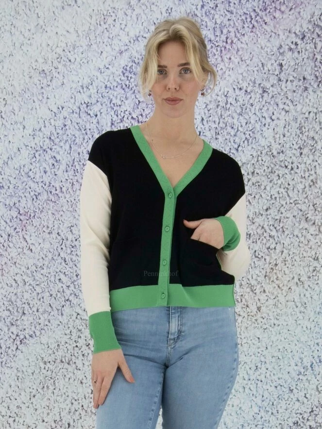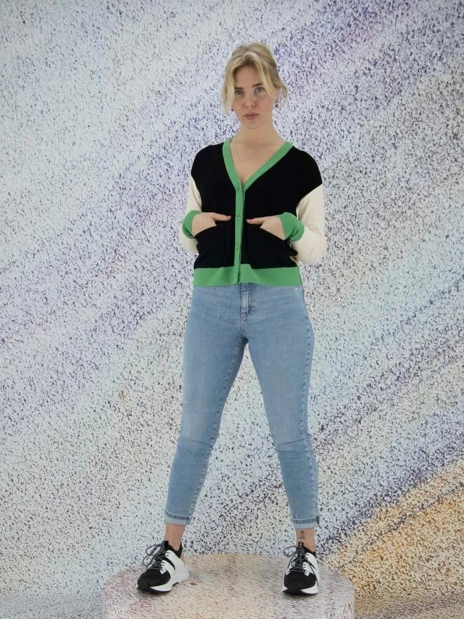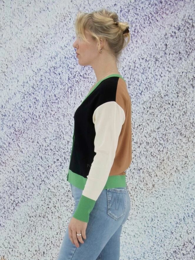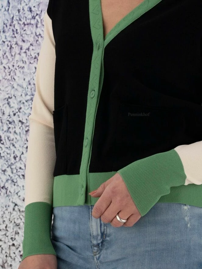 Gilet court de la marque Marc Cain. La pièce avant est en noir avec une bordure verte le long des bords. Le dos est de couleur chamois uni, les manches de couleur nude avec des poignets verts. La bordure de la patte de boutonnage est ornée de cœurs brodés ton sur ton. Le gilet est équipé de poches noires plaquées à l’avant. Lavage à 30 degrés.