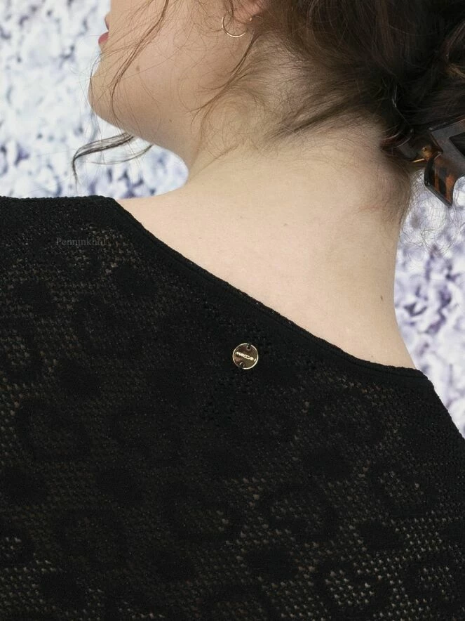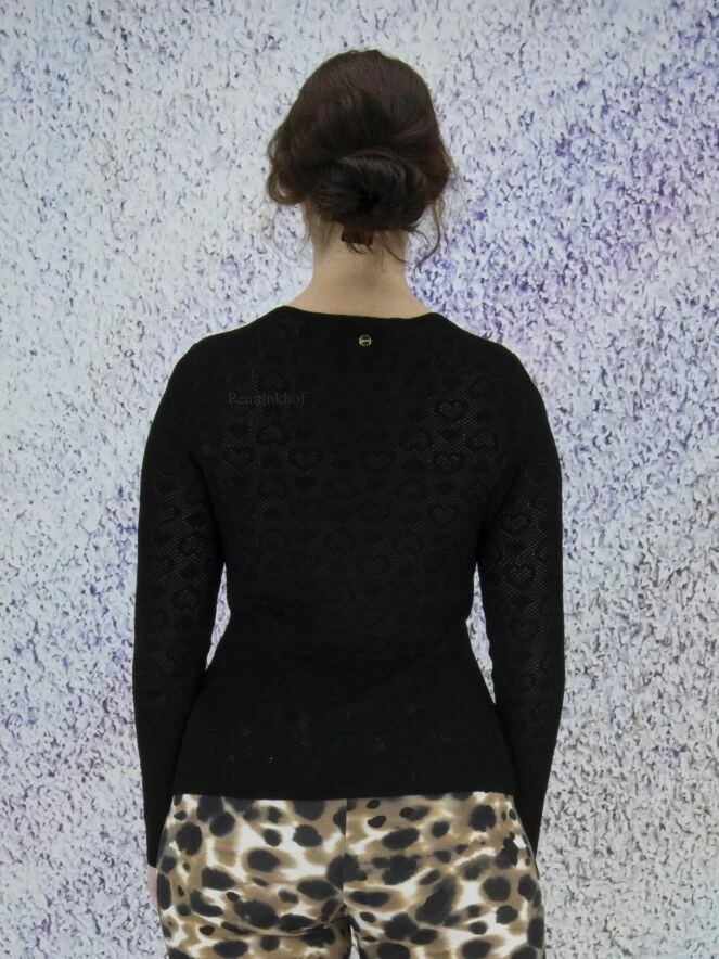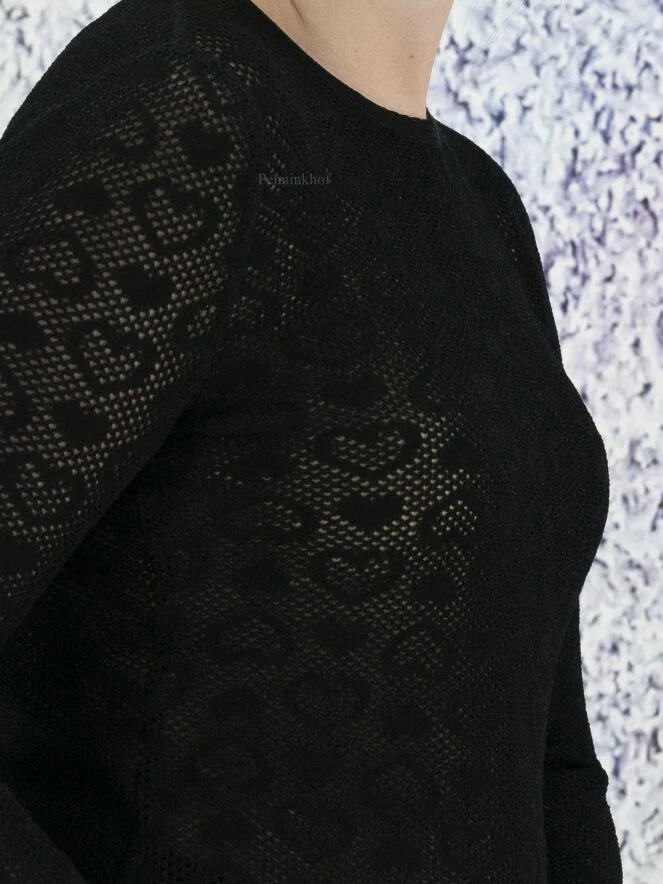 Tee-shirt transparent à fines perforations de la marque Marc Cain, de couleur noire. Une mosaïque de cœurs est tissée dans le tissu. Il présente un col rond et des manches longues. Lavage à 30 degrés.