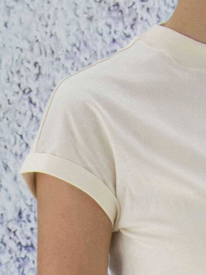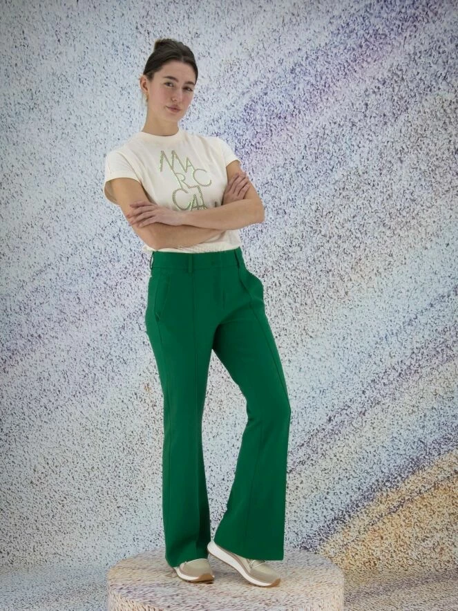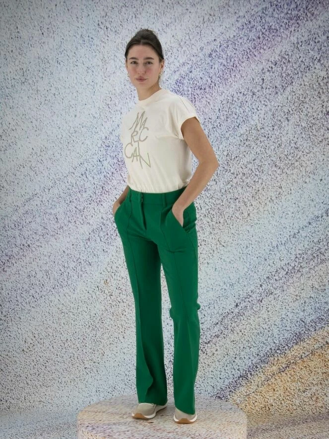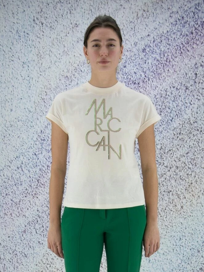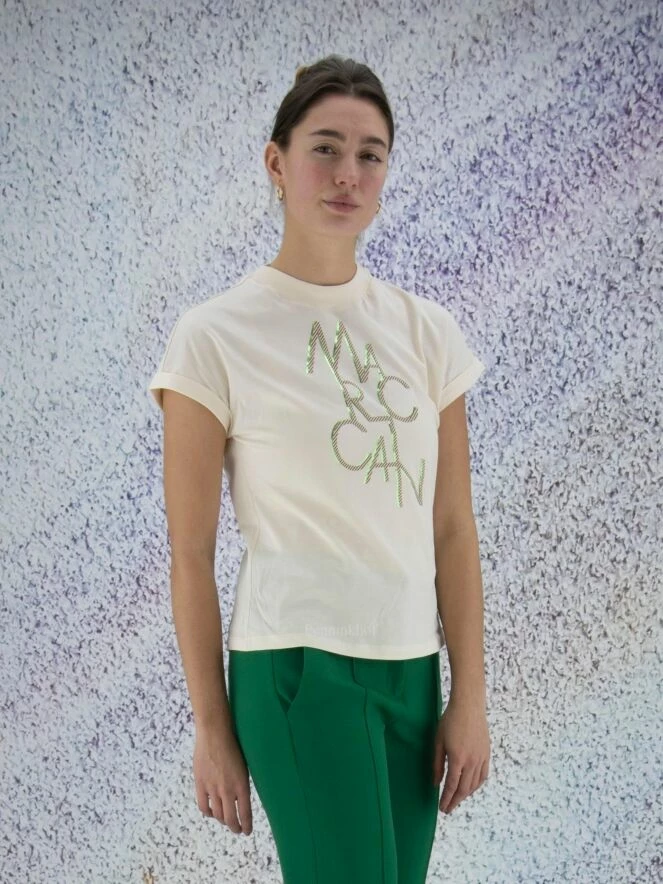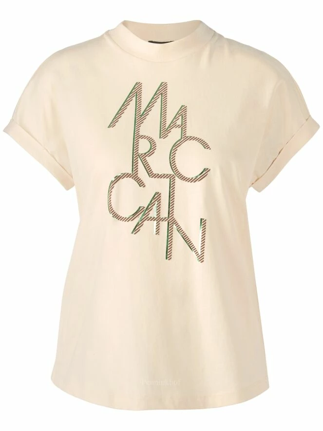 Tee-shirt de la marque Marc Cain, de couleur beige. Le devant est orné d’un grand « marc cain » en lettrage à fines rayures diagonales avec un ombrage vert. Lavage à 30 degrés.