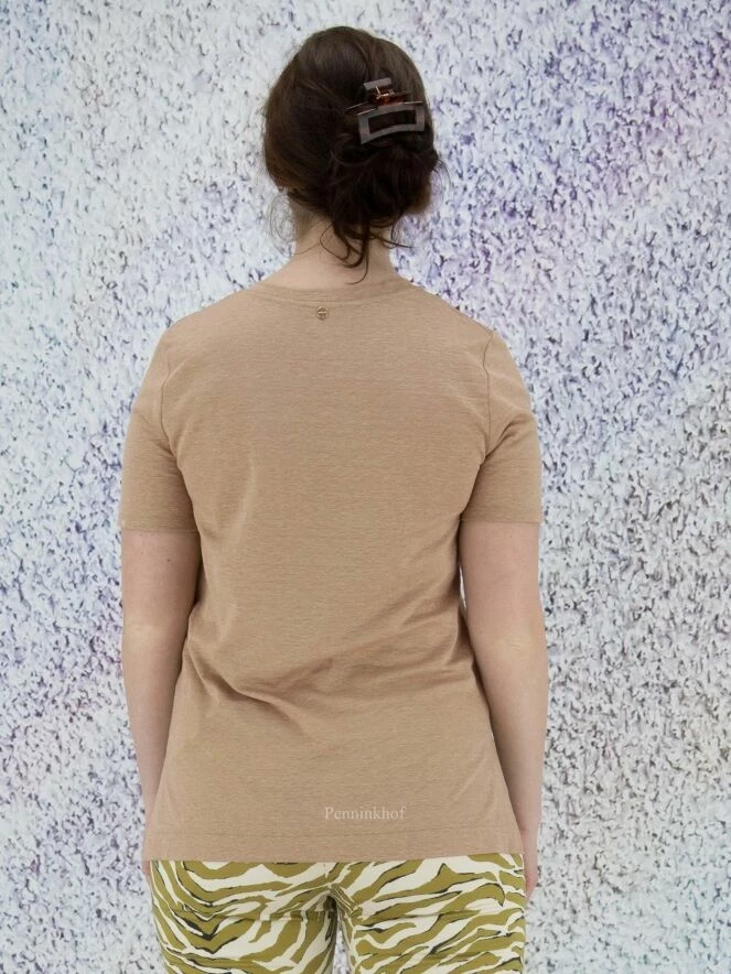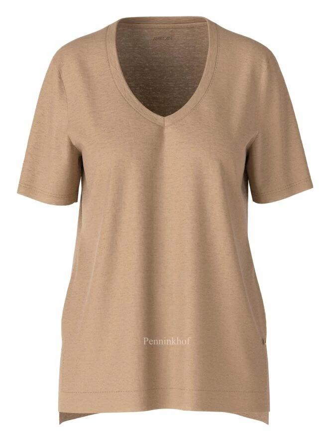 Tee-shirt à col en V arrondi de la marque Marc Cain, de couleur sable chiné. Ce modèle présente une coupe légèrement plus longue au dos avec de courtes fentes sur les côtés. Lavage à 30 degrés.