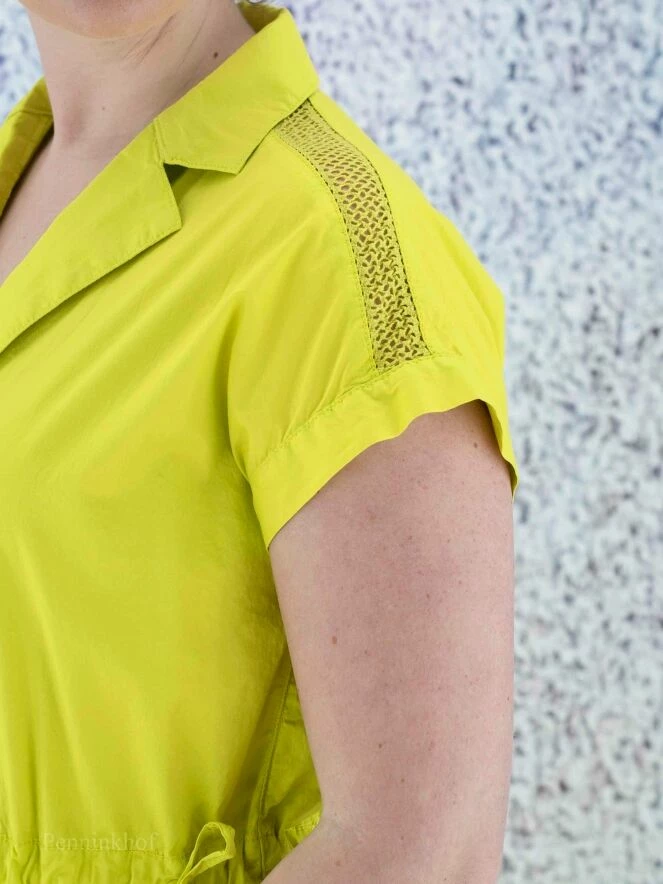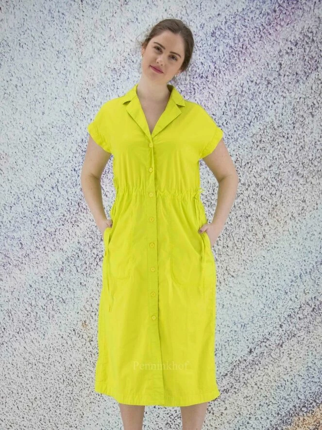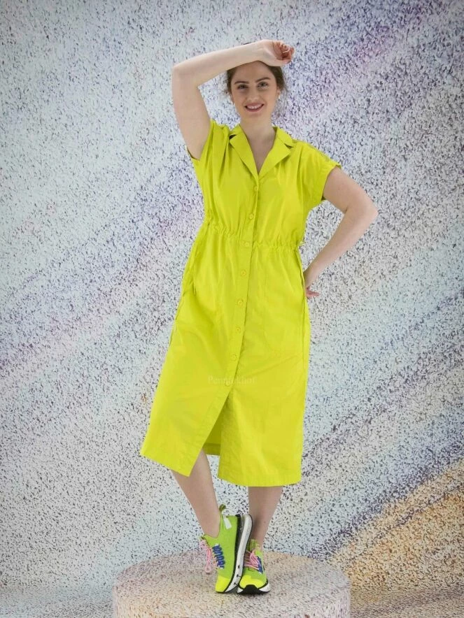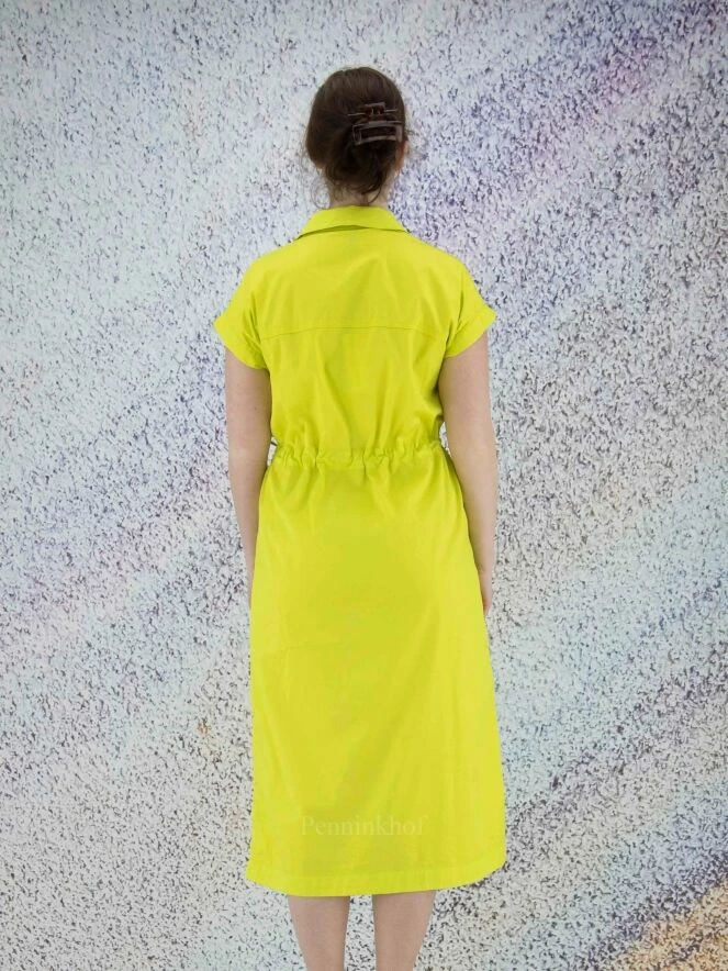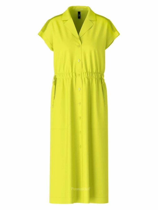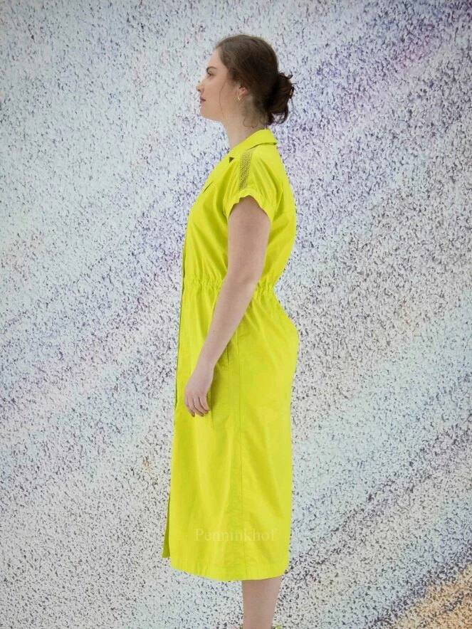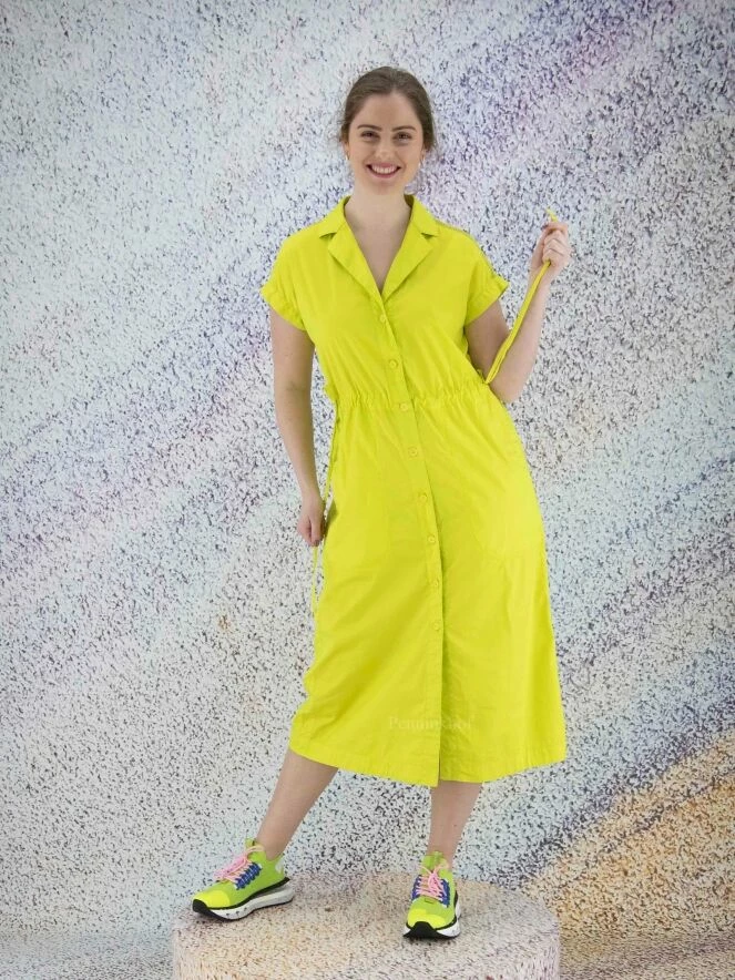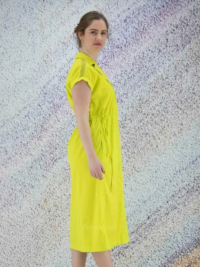 Robe boutonnée de la marque Marc Cain, de couleur vert lime. À la taille, une double couture froncée est dotée d’un ruban sous tunnel permettant d’être resserrée par les côtés. La robe est équipée de poches fendues. Les épaules sont ornées d’une bande à dentelle ajourée. Lavage à 30 degrés.