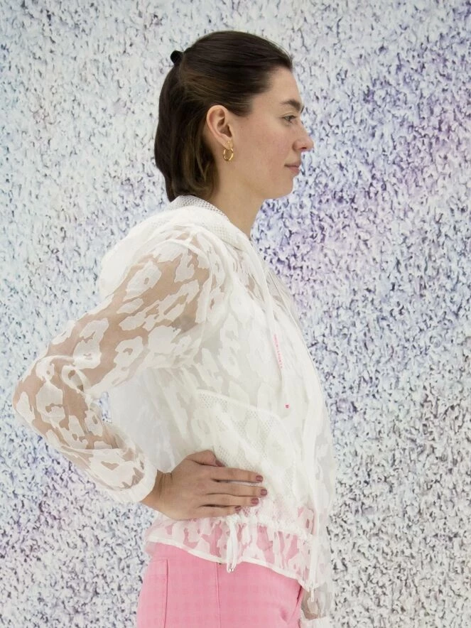 Cardigan transparent à capuche de la marque Marc Cain, à structure léopard de couleur blanc crème. La capuche est bordée par un cordon coulissant sous tunnel permettant le réglage. La capuche et les poches latérales sont doublées de maille filet. Ce modèle se ferme par un zip et possède un cordon coulissant sous tunnel au-dessus de la base. Les manches sont dotées d’une finition élastique. Lavage à 30 degrés.