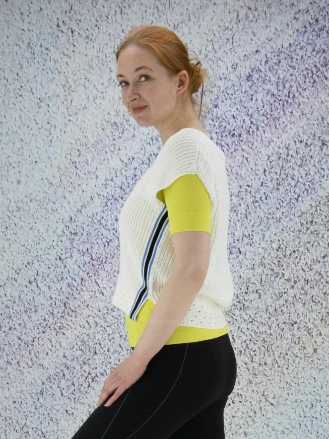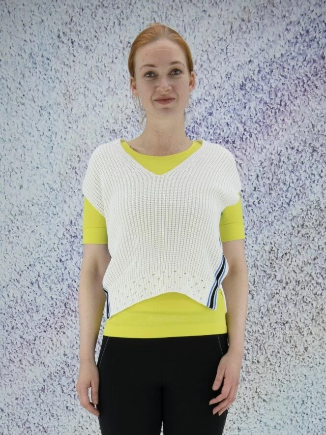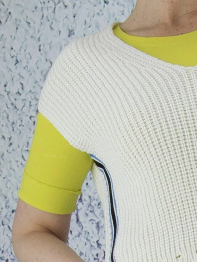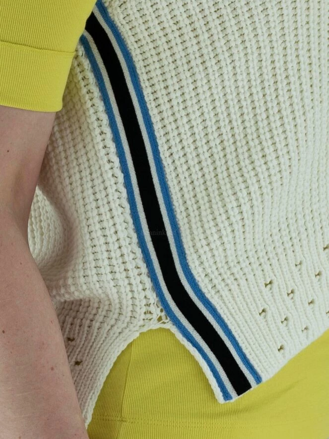 Spencer de la marque Marc Cain, de couleur blanc crème. Bords en tricot ouvert avec de courtes fentes sur les côtés orne le bas du spencer. Il présente des manches raglan, un col en V et un motif à rayures bleu et noir sur les côtés. Lavage à 30 degrés.