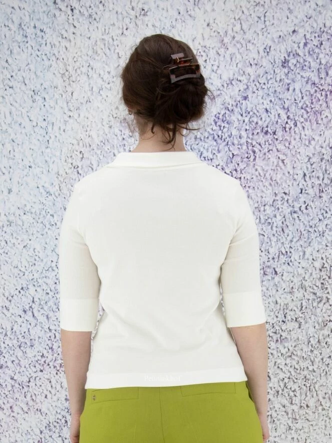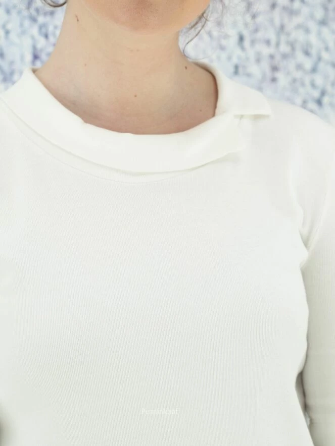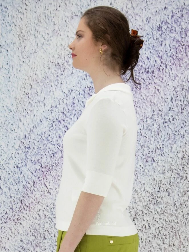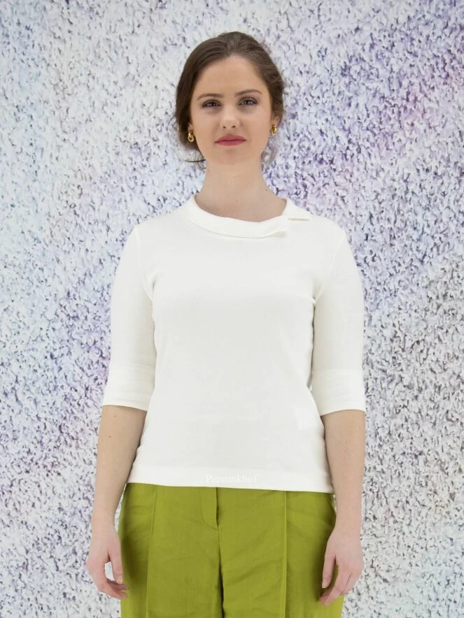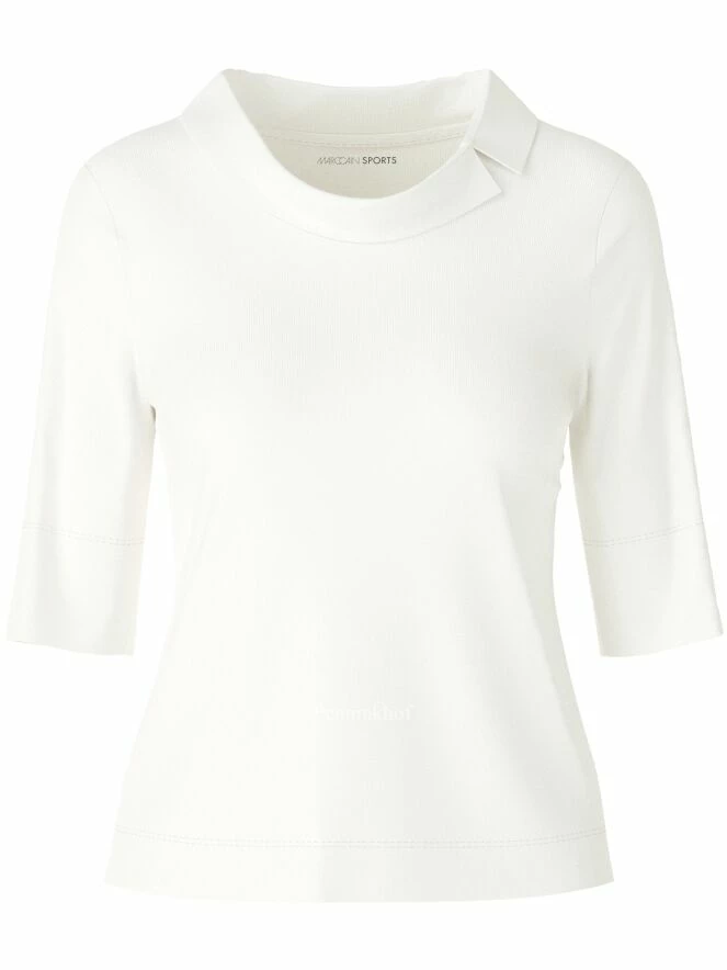 Tee-shirt à manches mi-longues de la marque Marc Cain, de couleur blanc crème. Le col montant présente une petite fente sur le côté. Le bas du tee-shirt est doté de fentes latérales. Lavage à 30 degrés.
