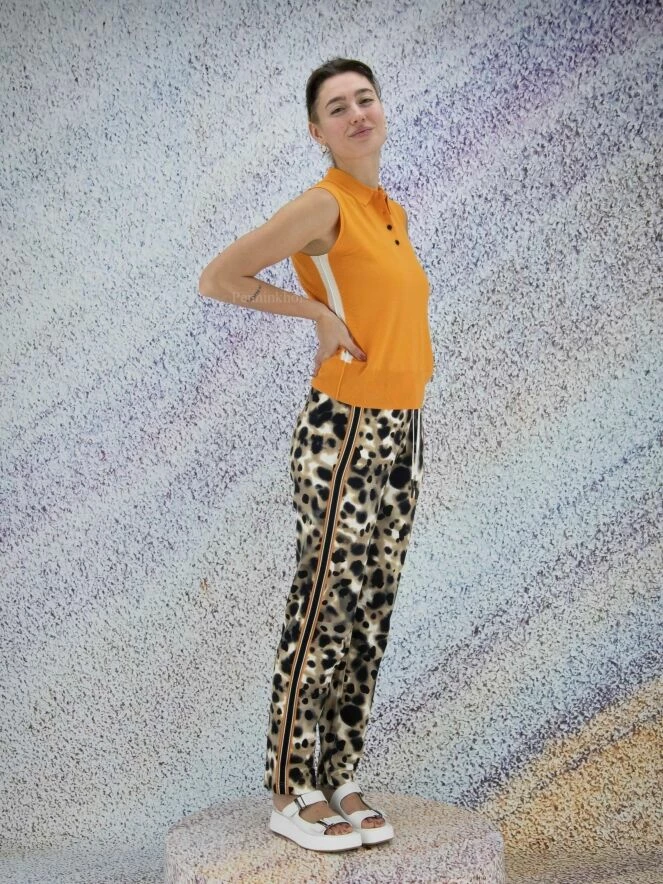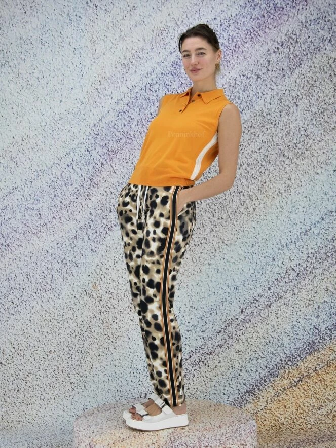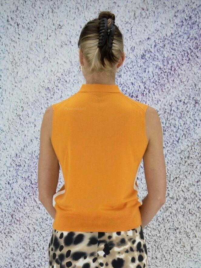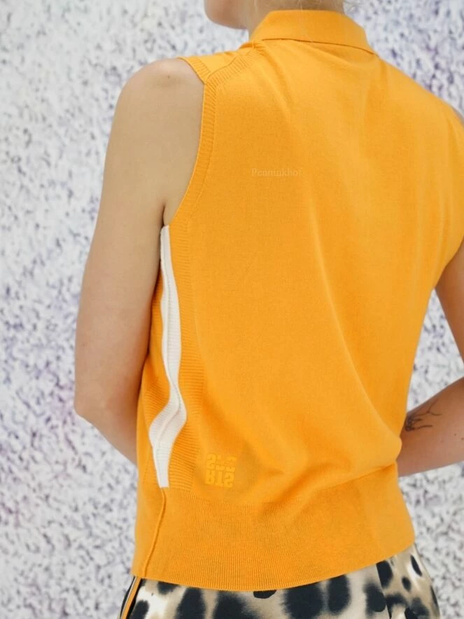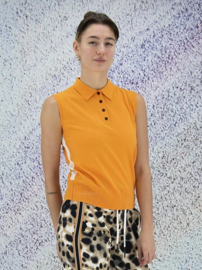 Polo sans manches de la marque Marc Cain, de couleur orange. Quatre boutons ferment le col à revers. Un passepoil blanc orne les côtés. Les emmanchures, les côtés et le bas du polo sont finement côtelés. Lavage à la main.