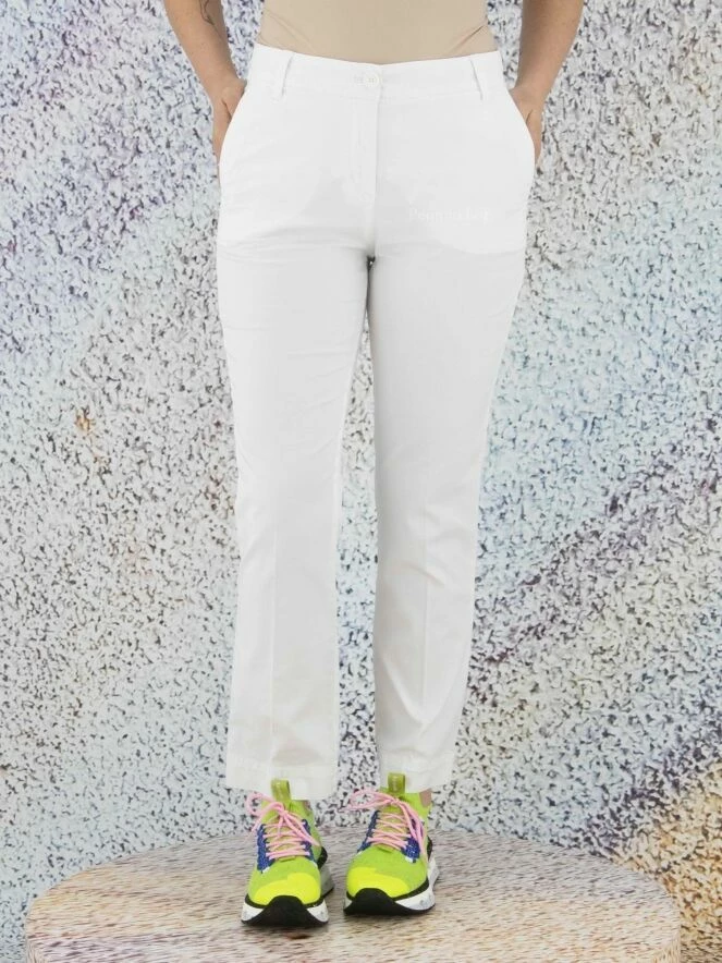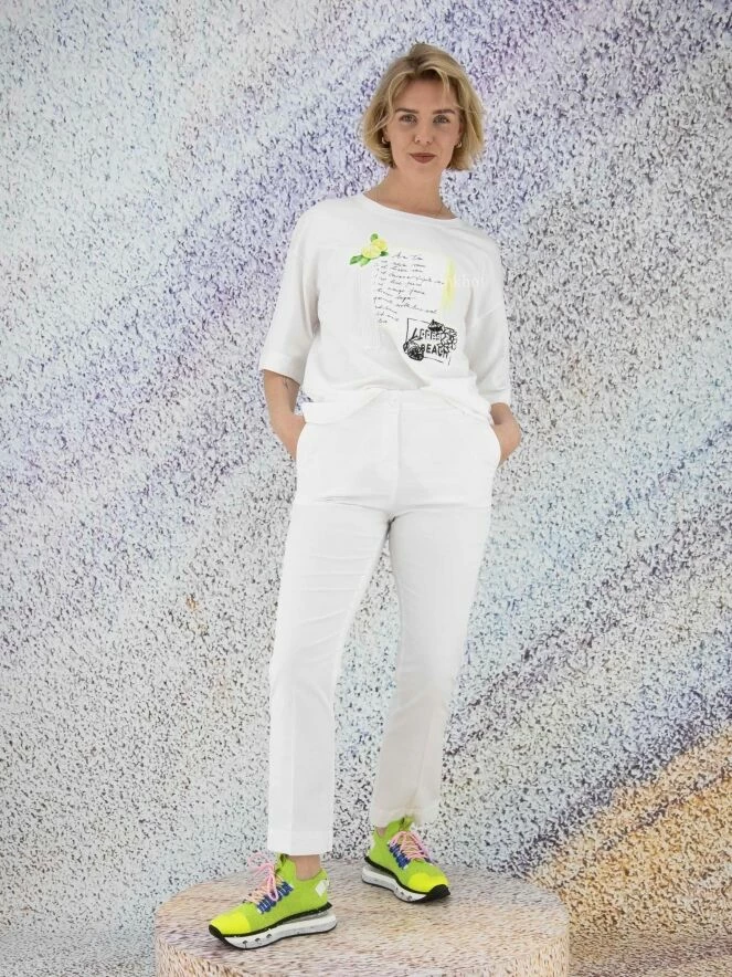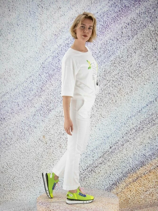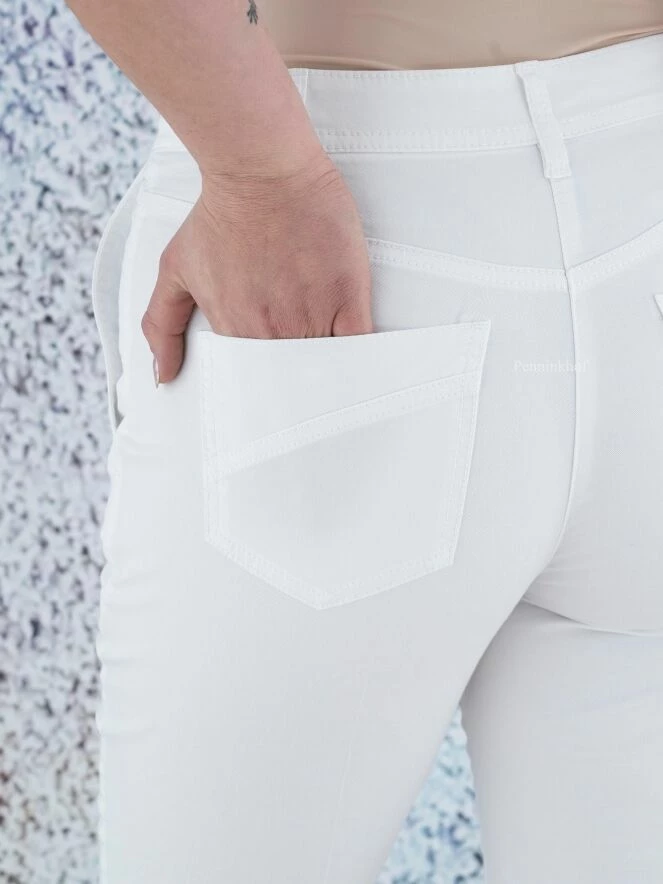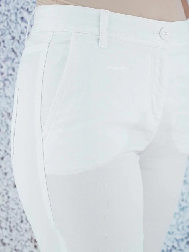 Pantalon basique de la marque Marc Cain, de couleur blanche. Le pantalon présente un tissu en jean grossier. Le bas de la jambe est orné d’un très fin passepoil frangé. Ce détail revient sous le bord de la ceinture. Le pantalon est doté de poches latérales et de deux poches plaquées arrière ornées de doubles coutures. Lavage à 30 degrés.